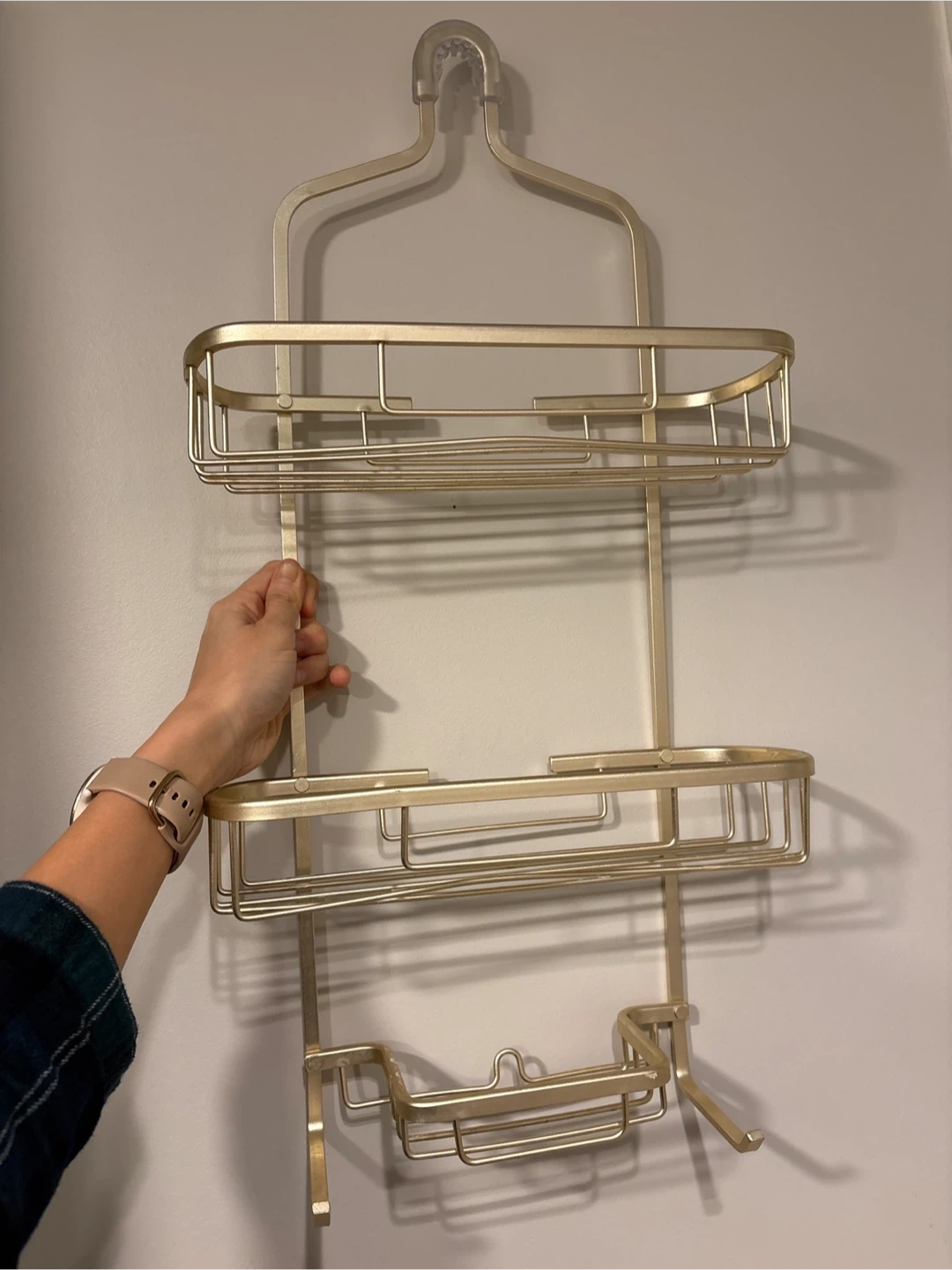 This is a gold metal shower caddy with two large shelves and a smaller soap dish. It hangs over the shower head for easy access. It's perfect for organizing your bathroom essentials!