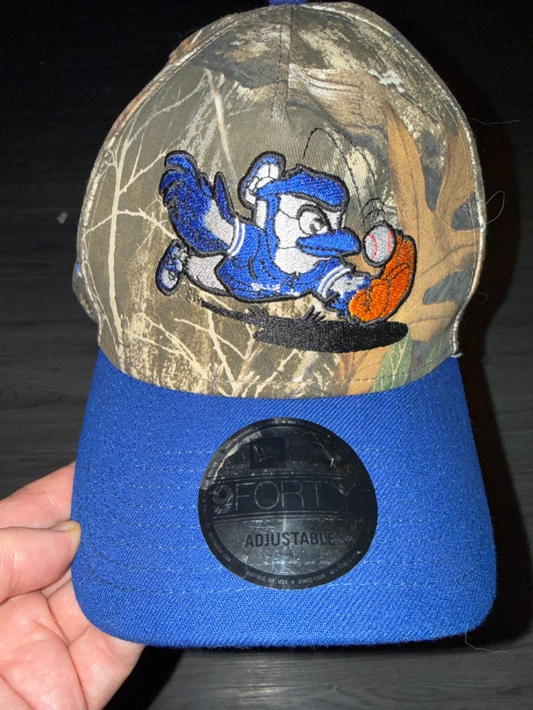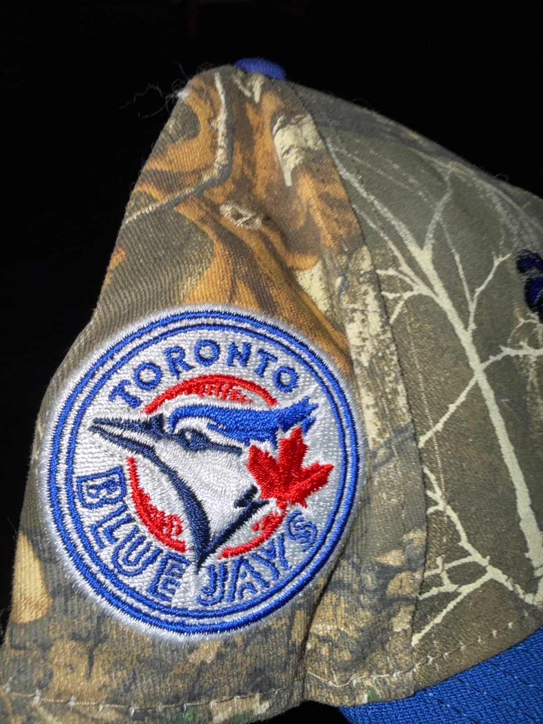 This New Era cap features a camouflage pattern with a Toronto Blue Jays logo. It's an adjustable OSFA (One Size Fits All) hat. A perfect cap for any Blue Jays fan!