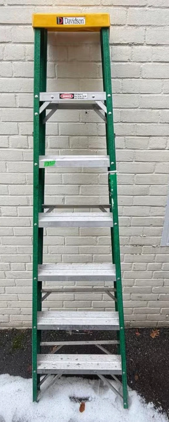 Davidson step ladder with green fibreglass rails. It has 7 aluminium steps. This ladder is great for reaching high places around the house or for DIY projects!