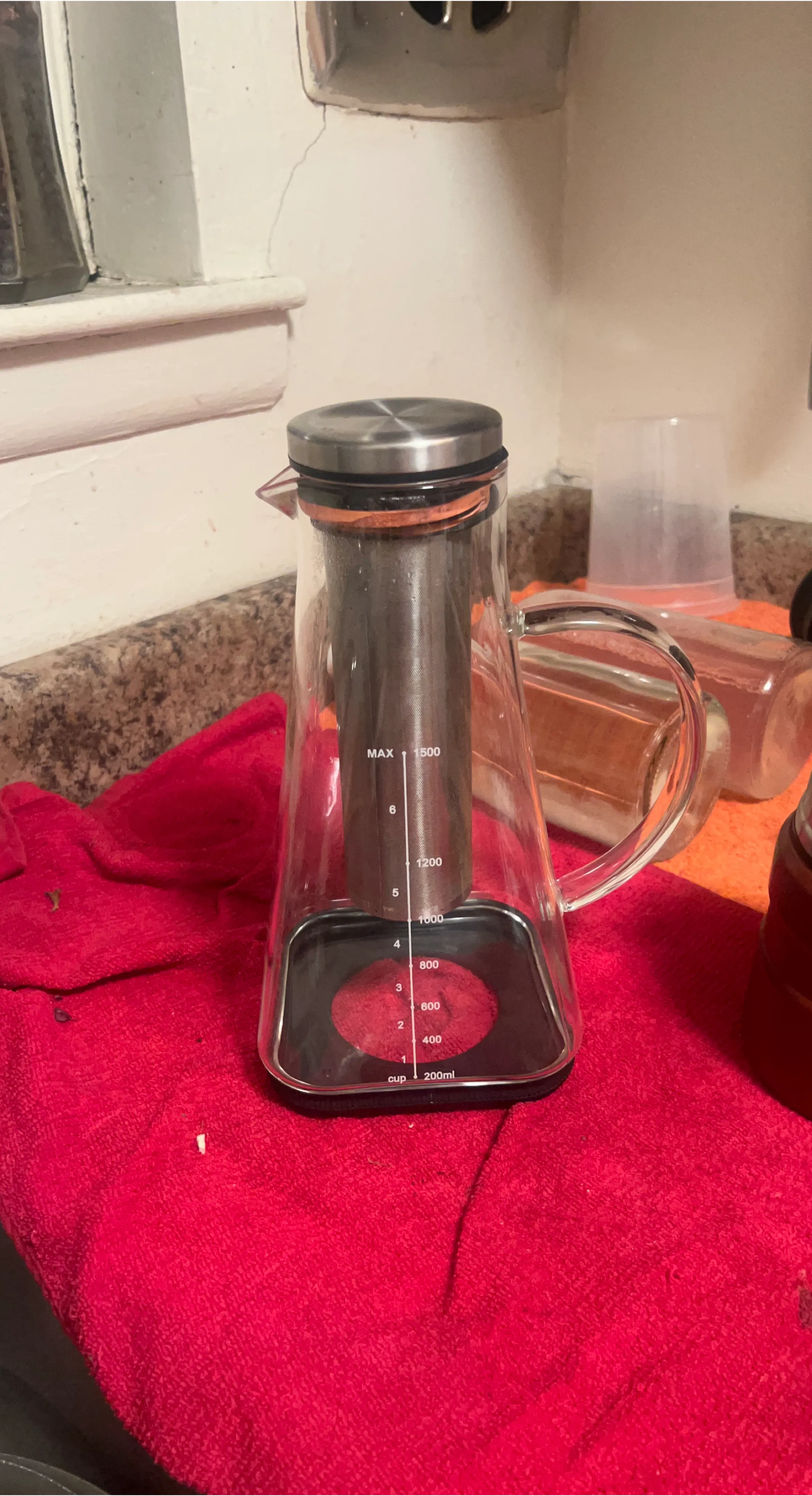 This glass pitcher is designed for making cold brew coffee. It includes a stainless steel infuser for grounds. The pitcher has measurement markings up to 1500ml. It's great for brewing large batches of cold coffee.