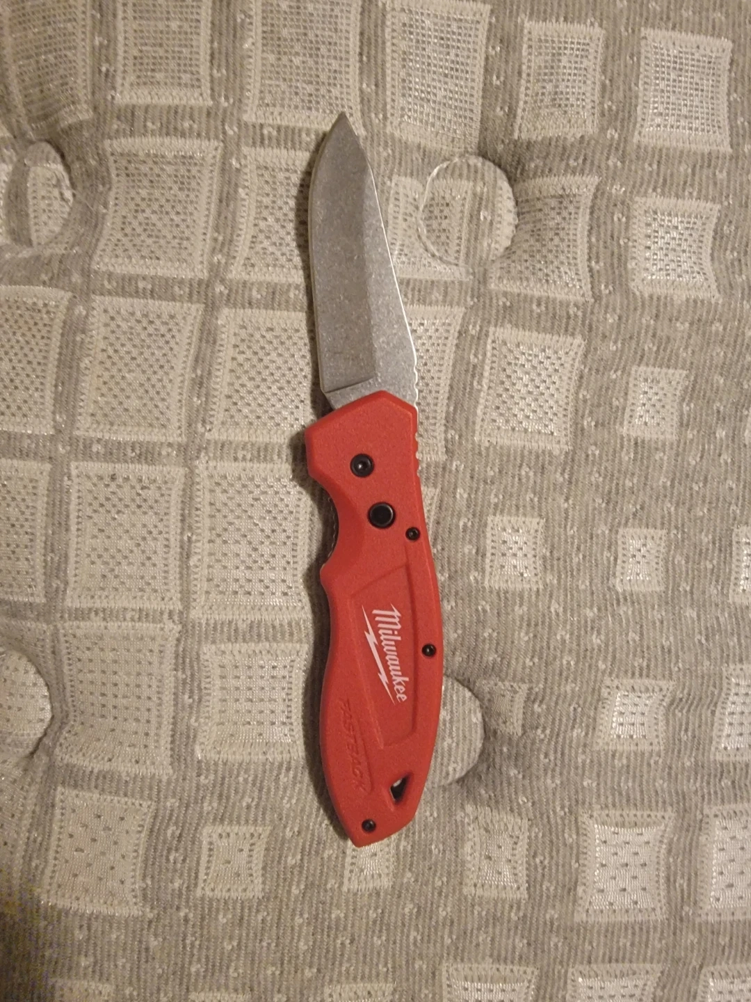 Milwaukee Fastback folding utility knife with serrated blade. Red handle with integrated lanyard hole. This knife's blade is made of metal. It's suitable for quick tasks. It's a handy tool to have around!