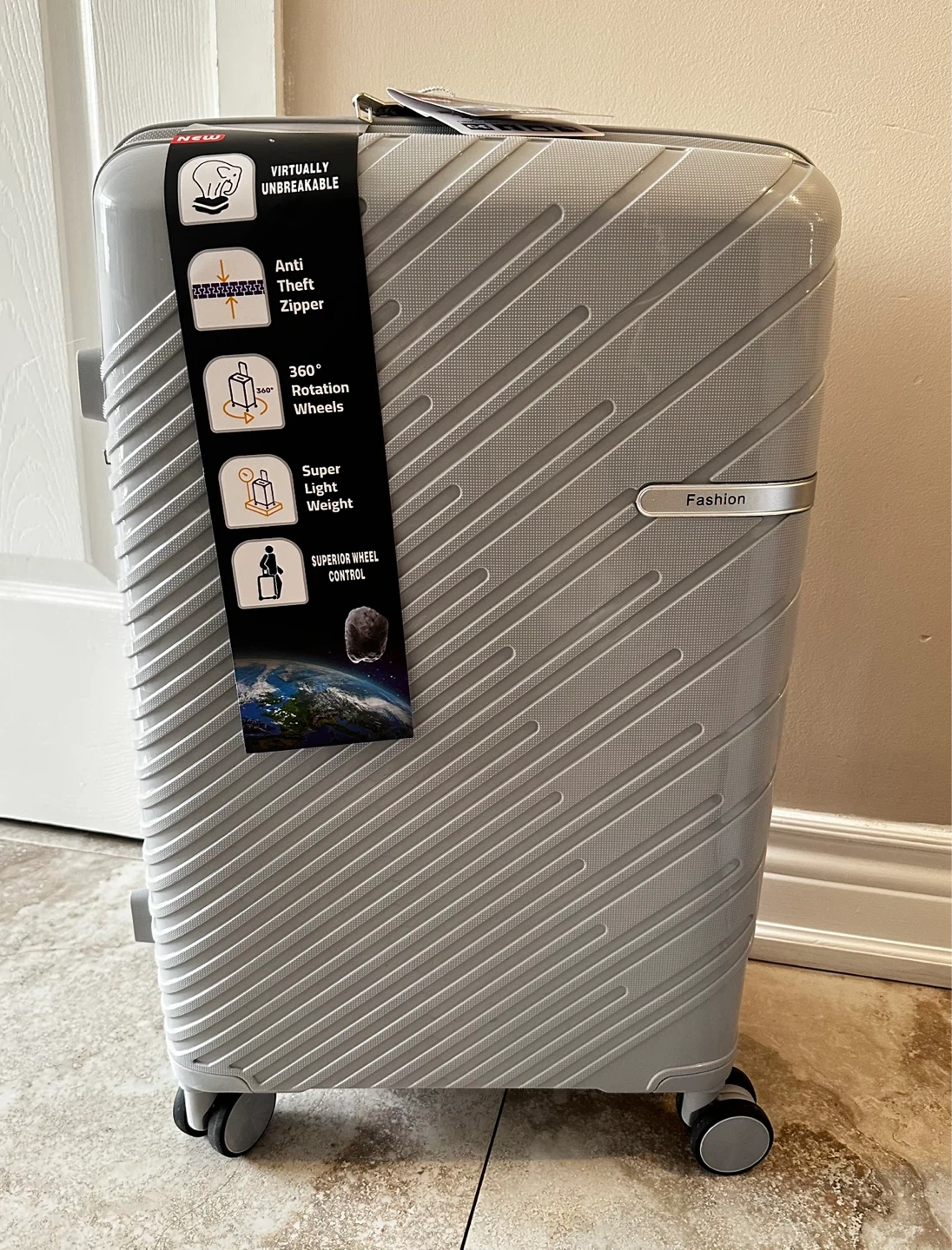 This grey brand new,L one piece hard-shell luggage features 360° rotation wheels for easy manoeuvring. It's virtually unbreakable with an anti-theft zipper and is super lightweight. Perfect for travellers who need durable and light baggage. Only for $65