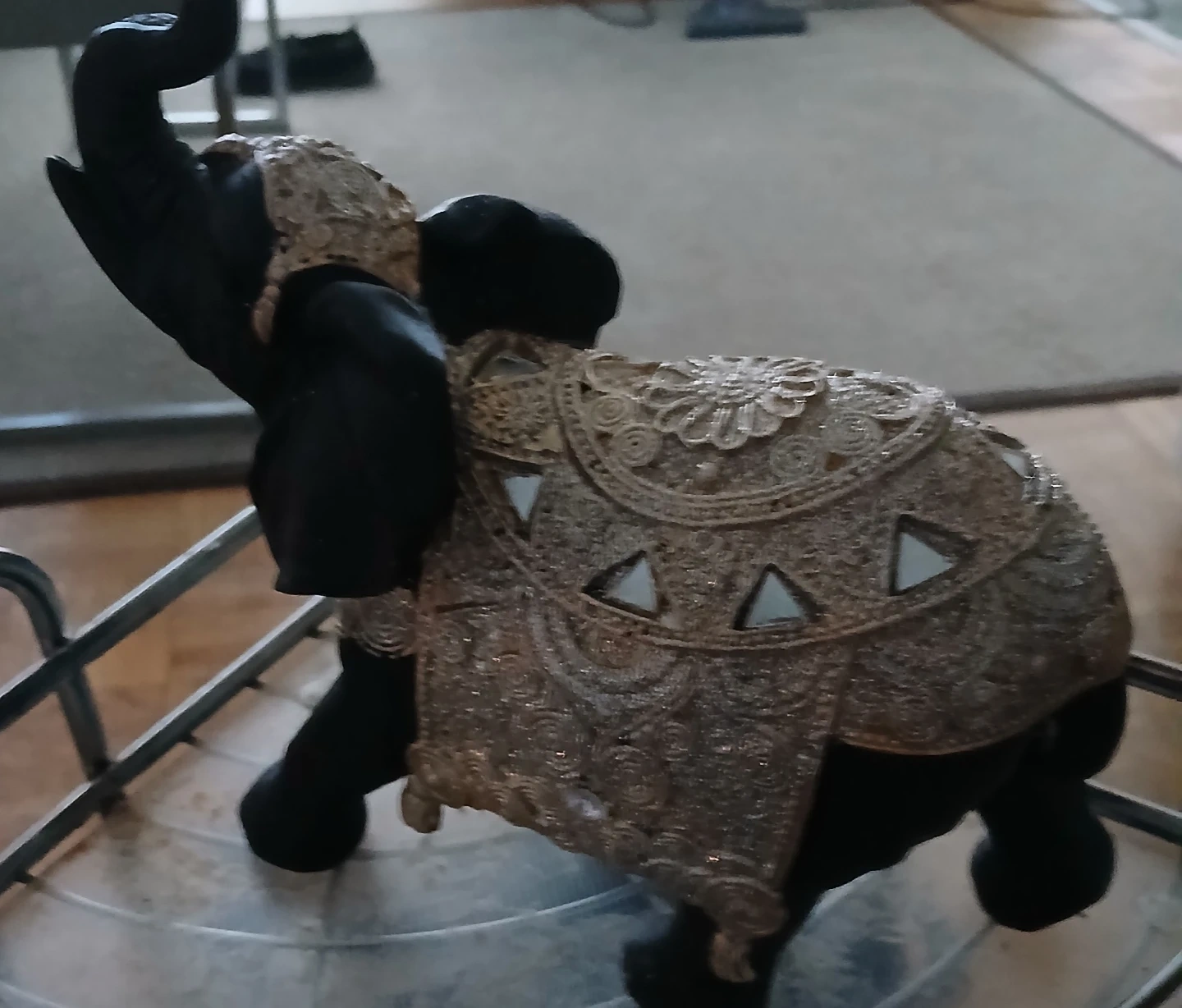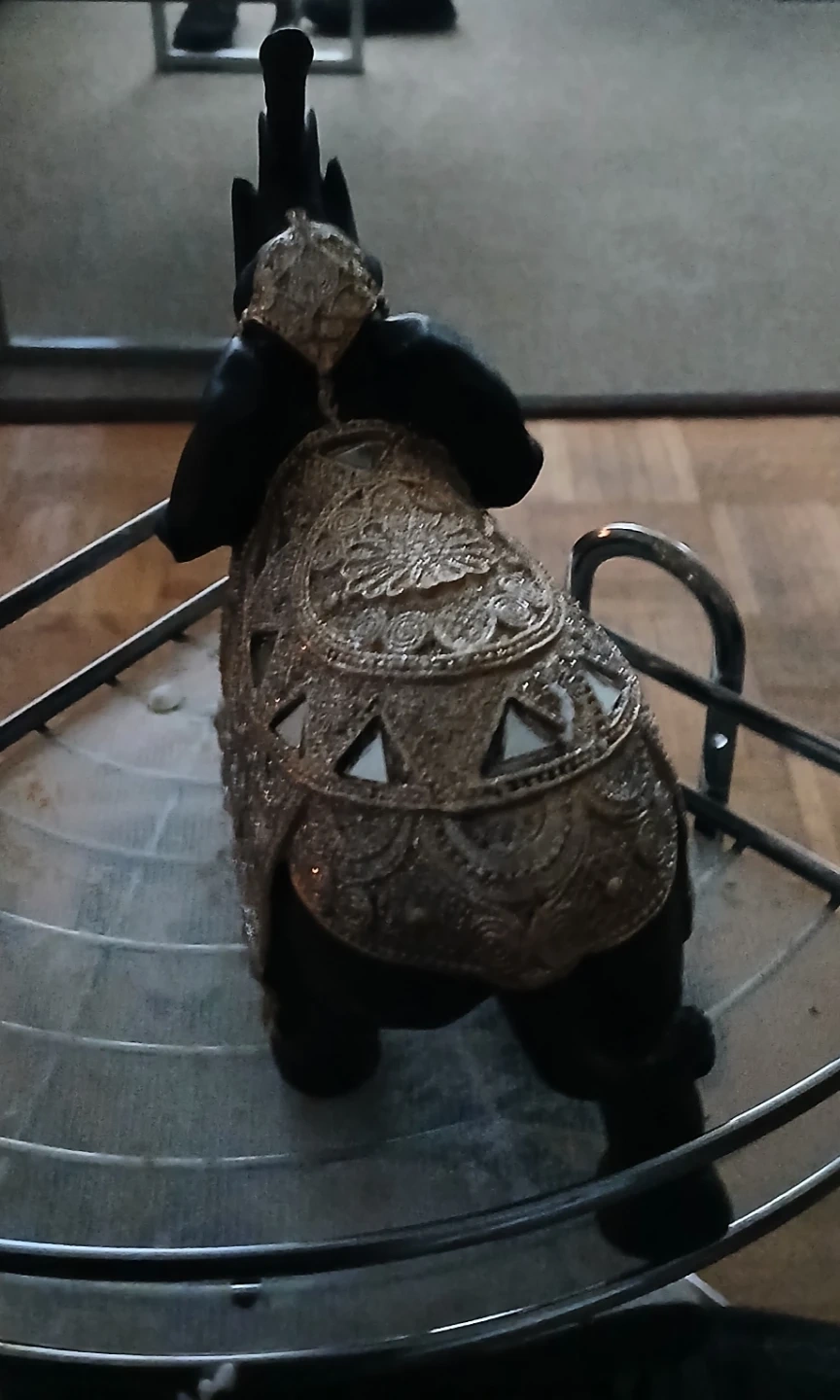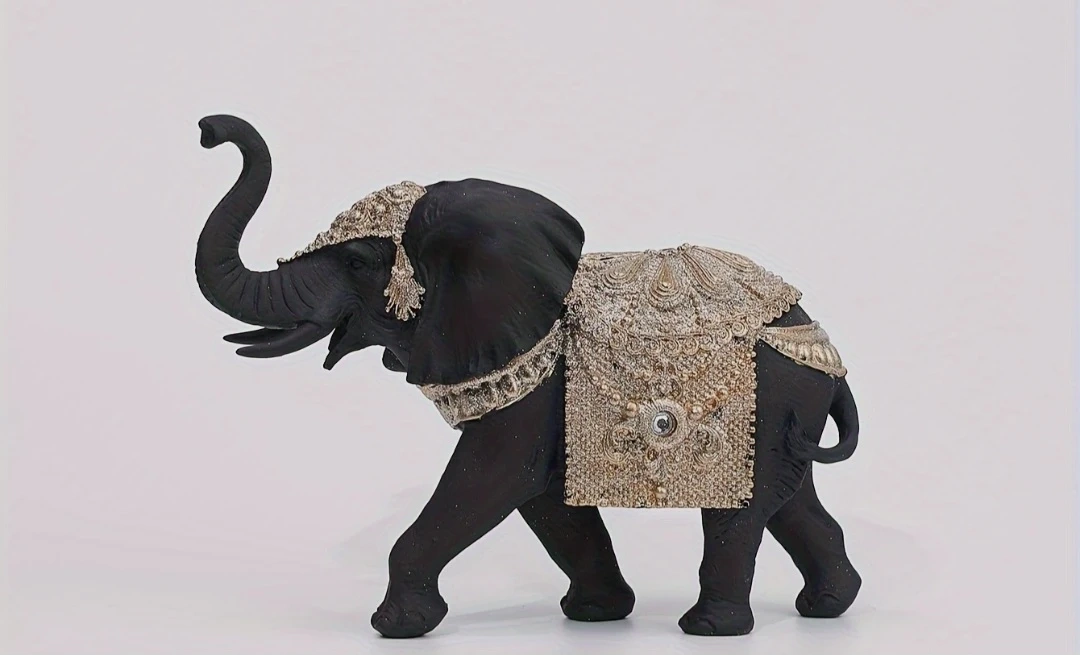 This decorative elephant figurine is a striking accent piece. It's made of dark material, possibly resin or wood, and adorned with ornate gold-toned decorative fabric and mirrored accents on its back and head. It stands with its trunk raised, showcasing intricate detailing.