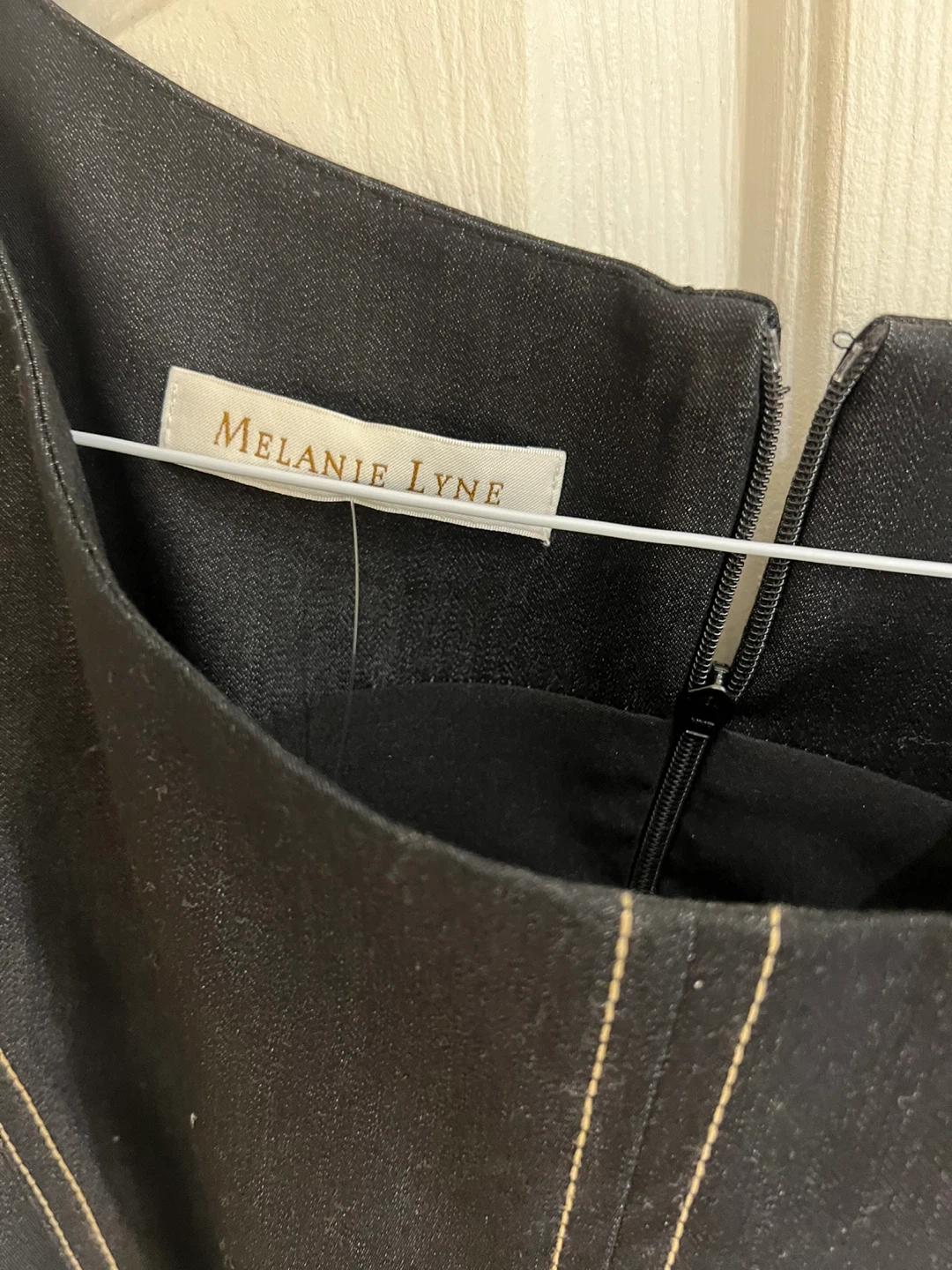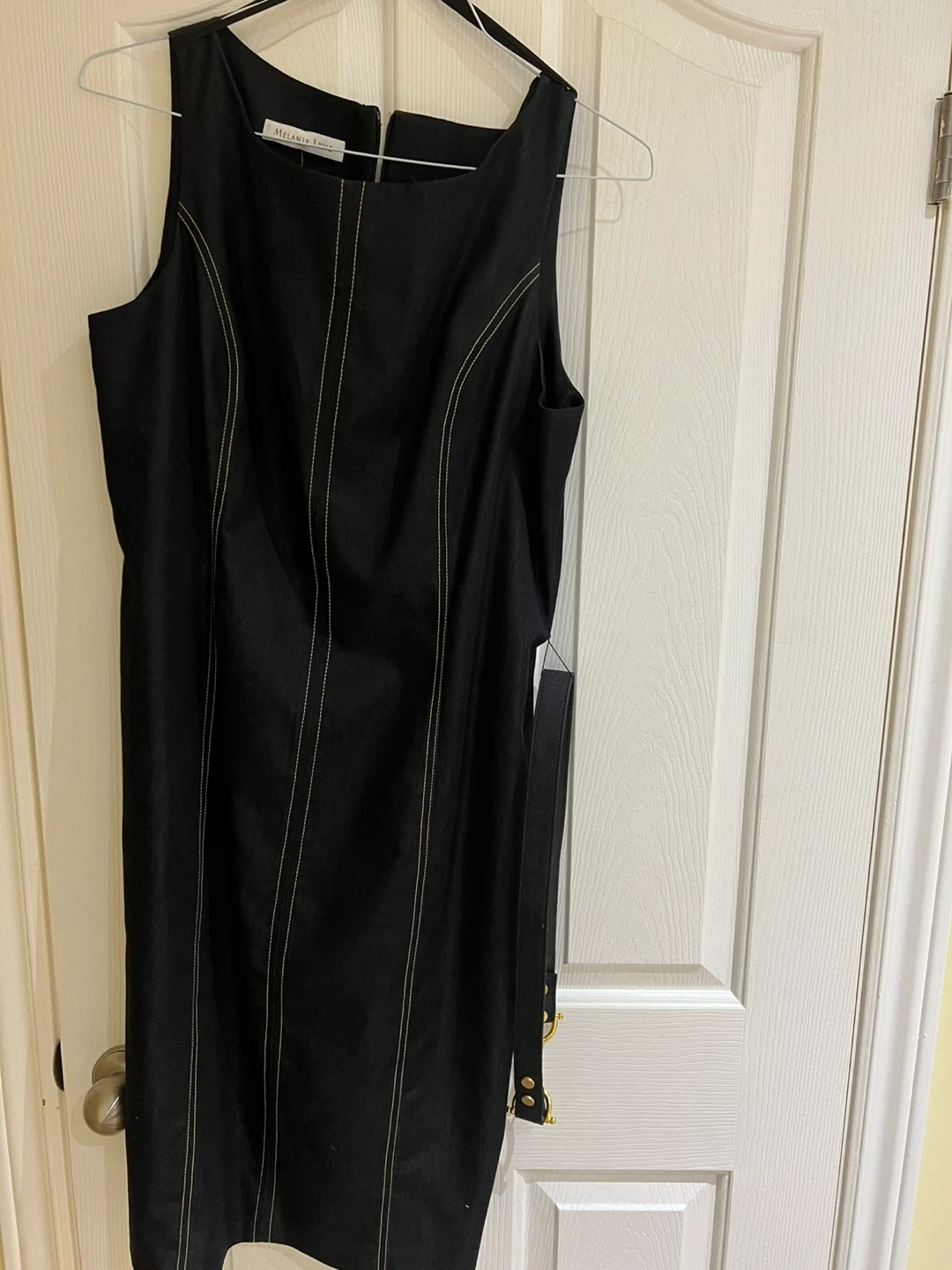 Sleeveless black dress by Melanie Lyne. Includes a matching belt with gold hardware. Features contrasting yellow stitching. Size 12. Original price $180.00.