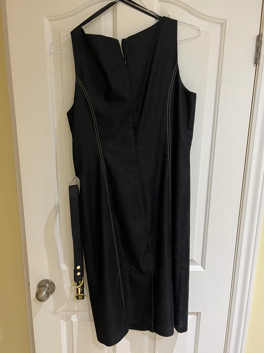 Sleeveless black dress by Melanie Lyne. Includes a matching belt with gold hardware. Features contrasting yellow stitching. Size 12. Original price $180.00.