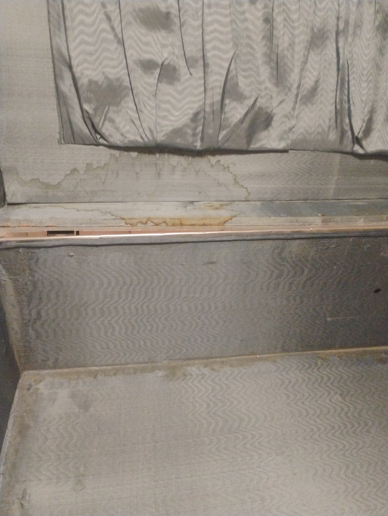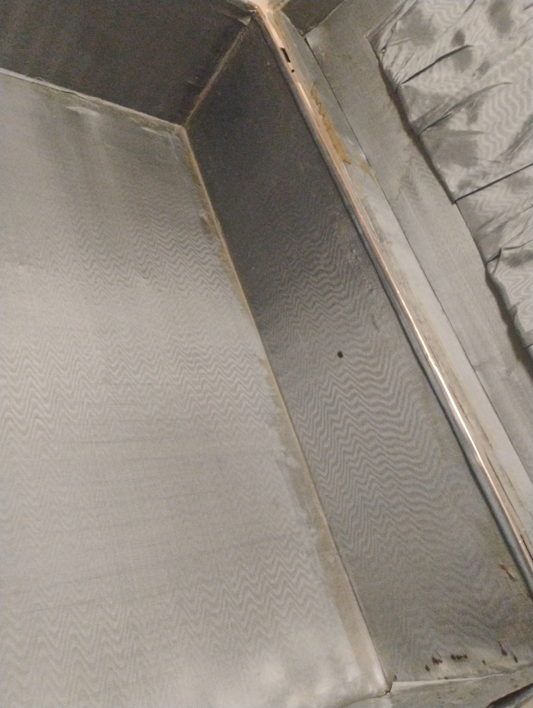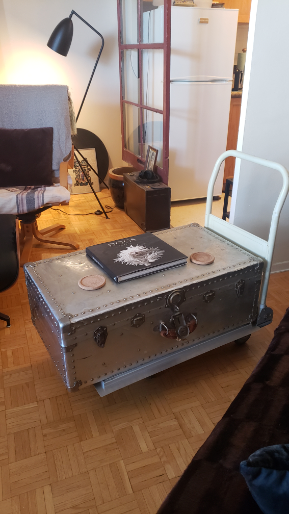 Metal trunk, riveted detailing. Features a latch closure. The trunk sits on a hand truck with wheels. It's the perfect place to relax and read a book.