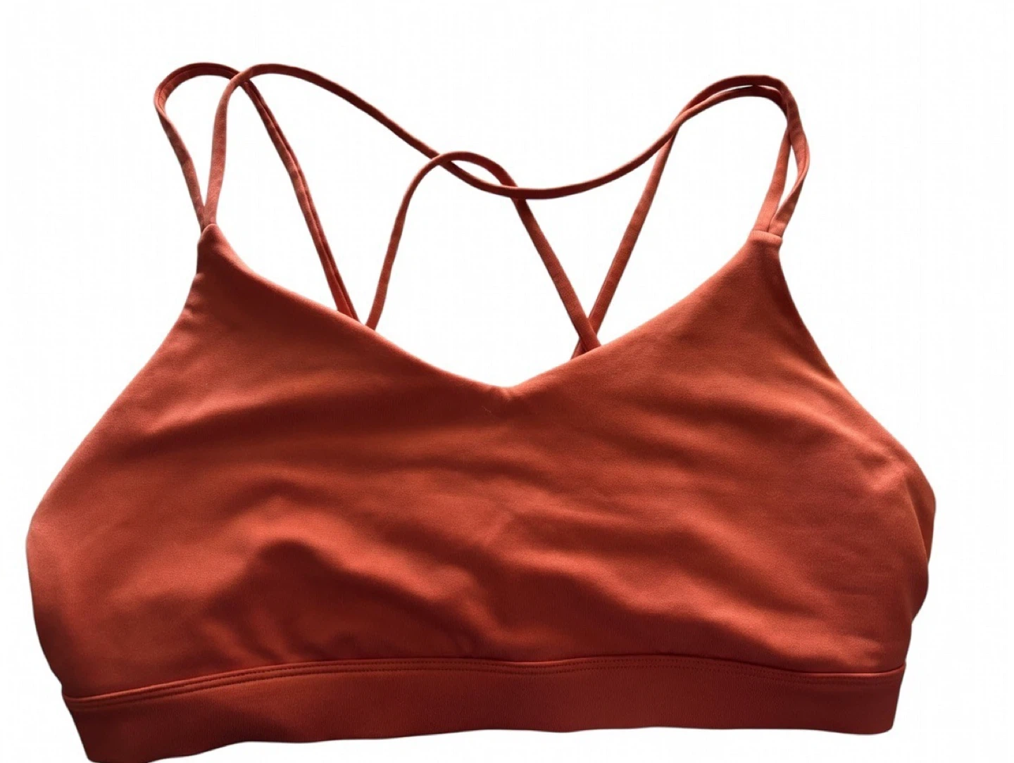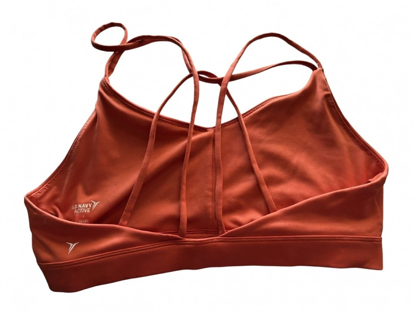 This Old Navy Active sports bra comes in a vibrant orange color. It's a size large. The criss-cross strap design offers comfortable support during workouts.