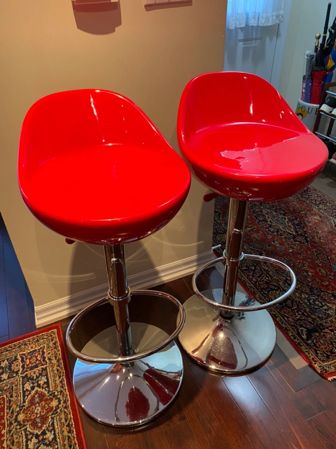 Set of 2 bar stools. Bright, ferrari red seats with stainless stain legs. Height adjustable with lever underneath seat.