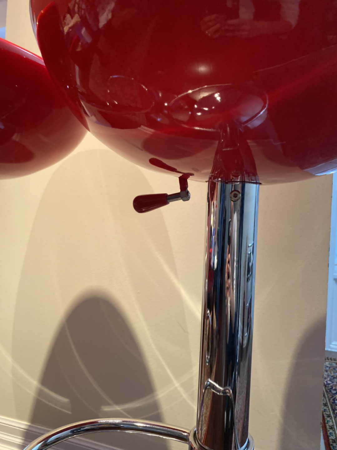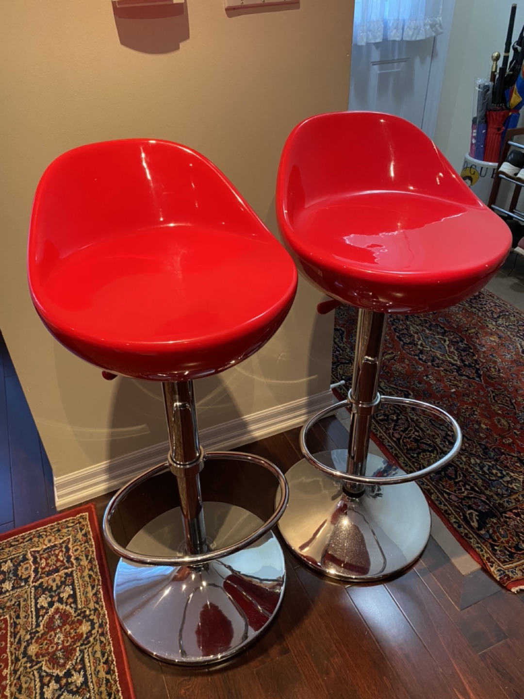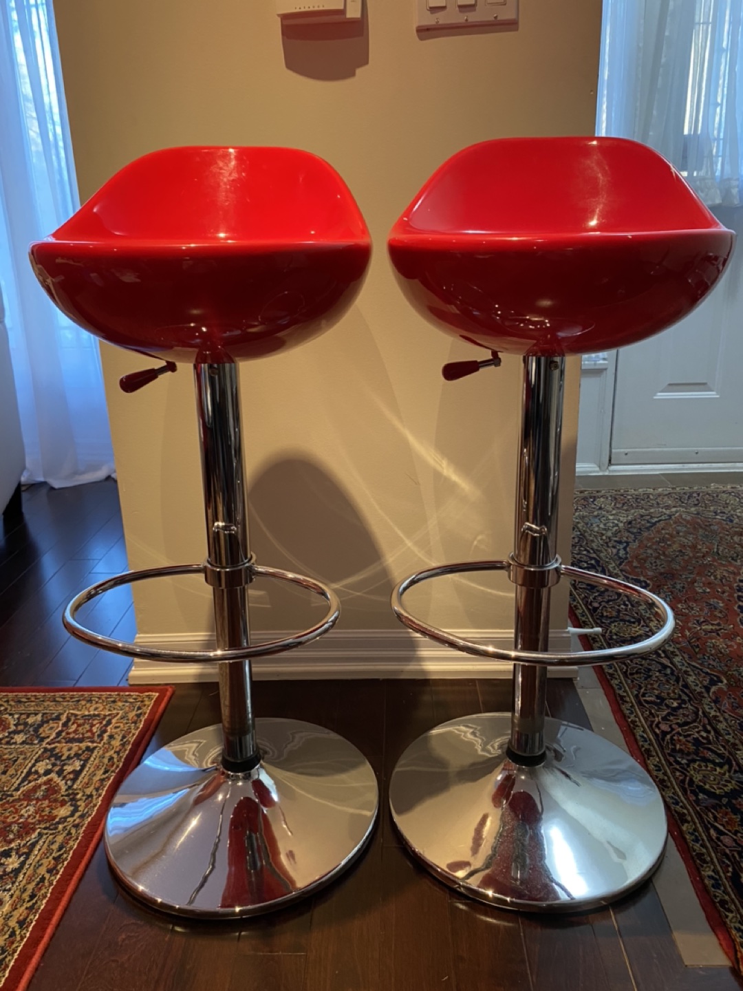 Set of 2 bar stools. Bright, ferrari red seats with stainless stain legs. Height adjustable with lever underneath seat.