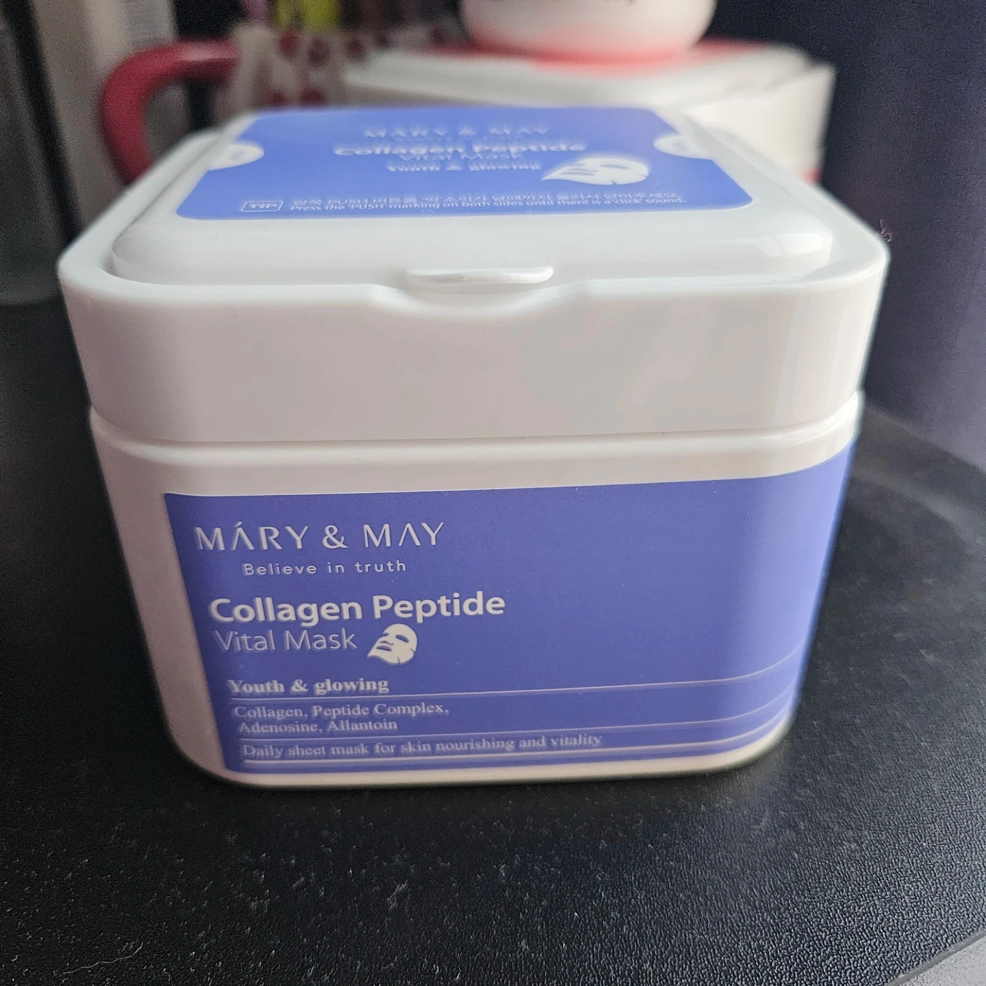 MARY & MAY Collagen Peptide Vital Mask for youth & glowing skin. It's a daily sheet mask with Collagen, Peptide Complex, Adenosine, and Allantoin. For skin nourishing and vitality.