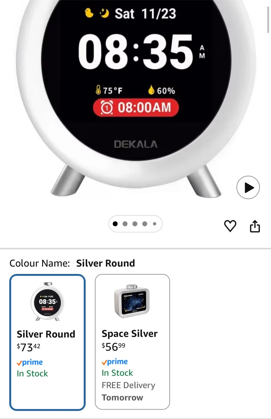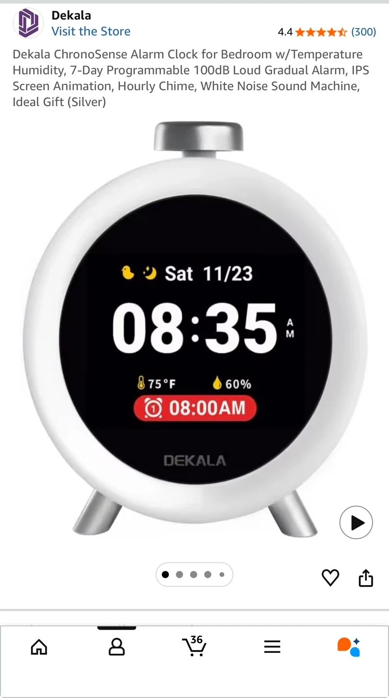 This is a Dekala ChronoSense alarm clock in silver. It displays time, temperature, and humidity. It also has an hourly chime and gradual alarm.