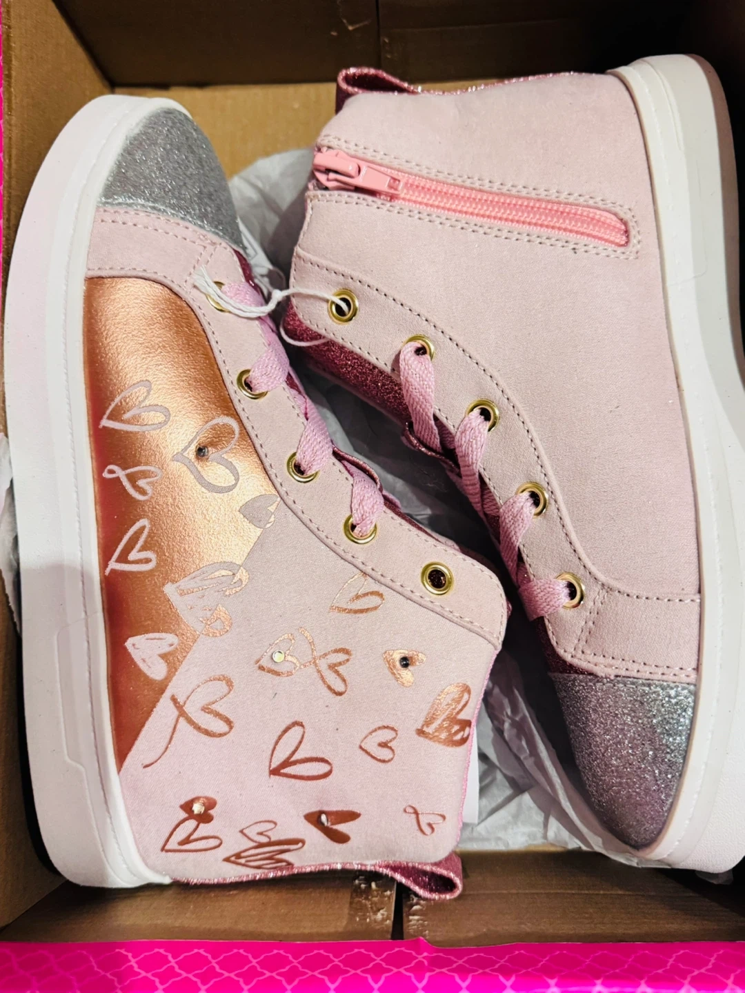 These adorable girls' high-top sneakers are brand new and come in their original box! They feature a lovely pink colour with glittery silver toes and fun heart designs. Perfect for adding a touch of sparkle to any outfit!