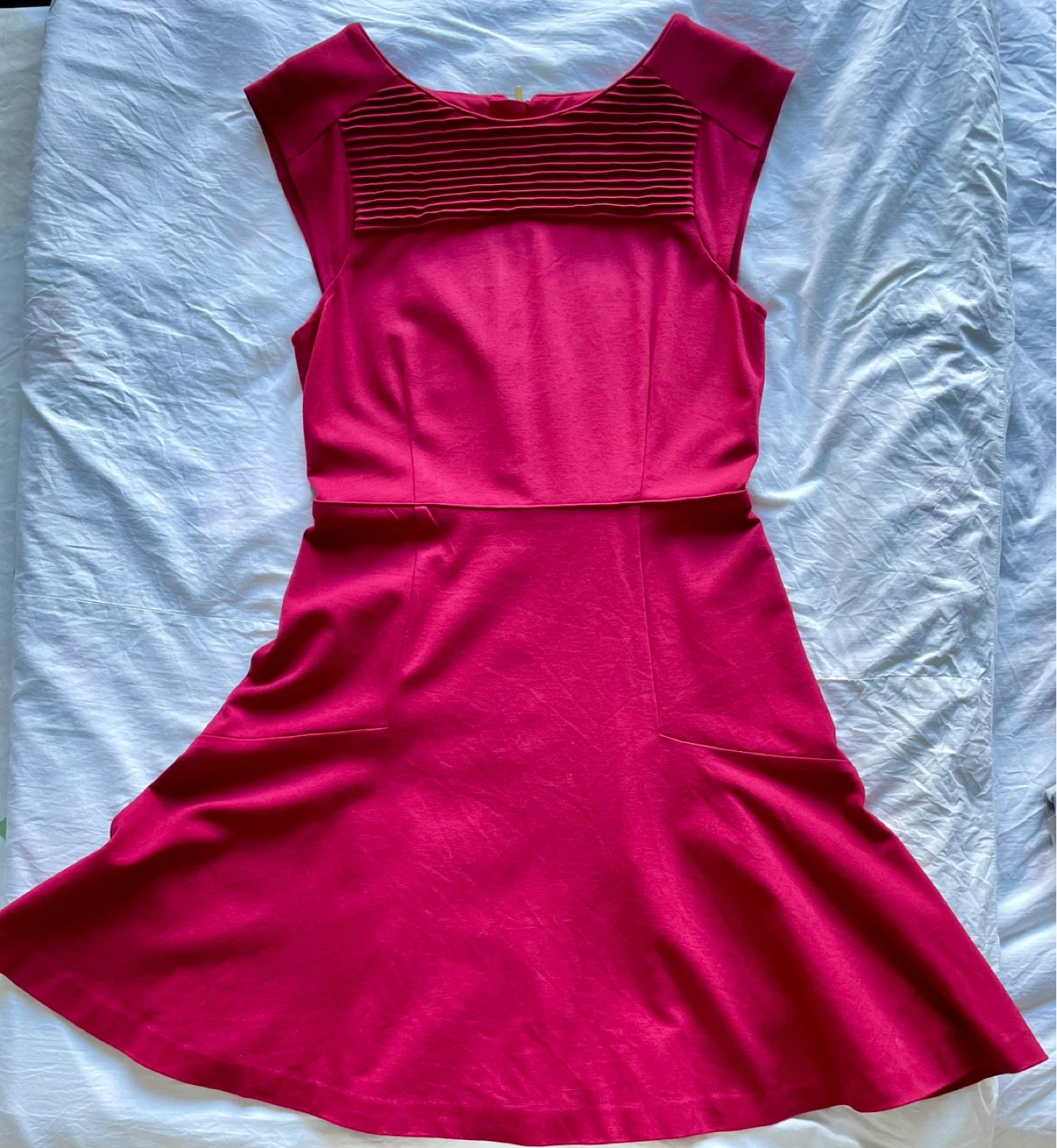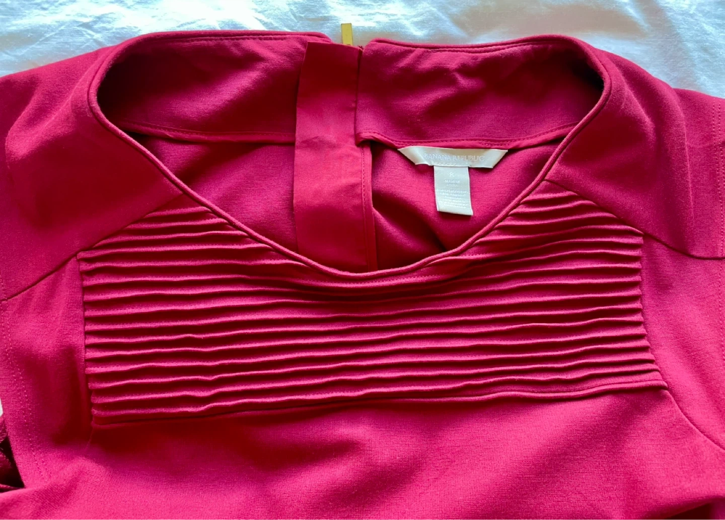 This Banana Republic dress comes in red wine colour. It features cap sleeves and a flattering fit-and-flare silhouette with subtle pleating detail at the neckline. A zippered back closure makes it easy to put on and take off. This dress is perfect for a semi-formal occasion or a stylish day out!