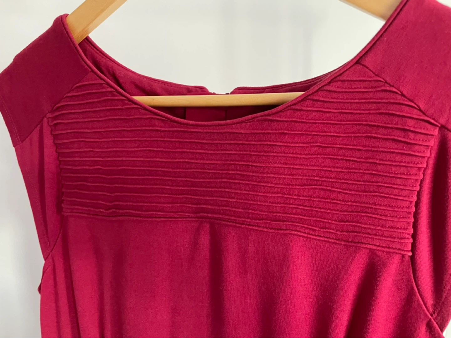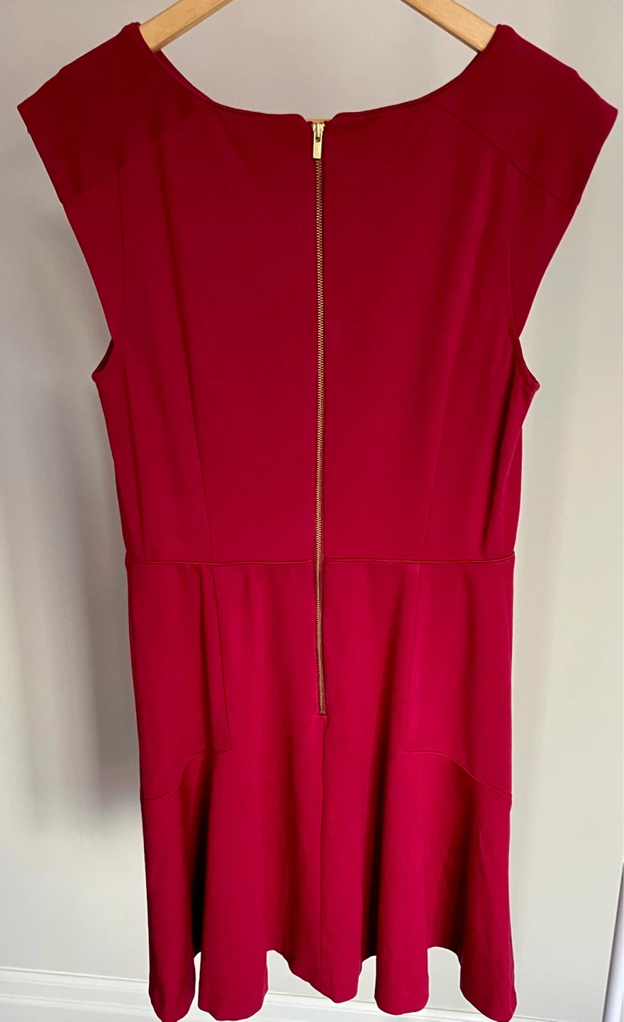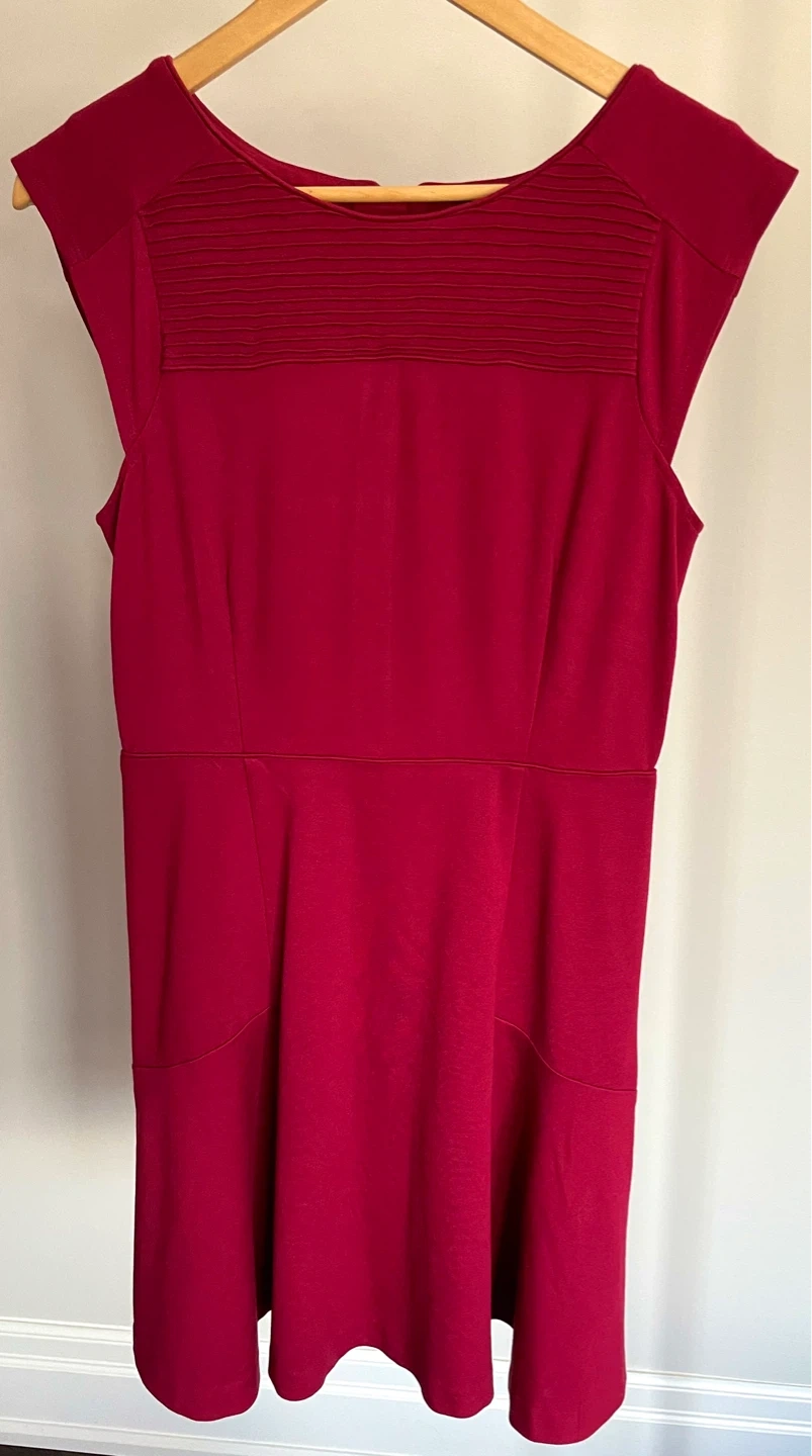 This Banana Republic dress comes in red wine colour. It features cap sleeves and a flattering fit-and-flare silhouette with subtle pleating detail at the neckline. A zippered back closure makes it easy to put on and take off. This dress is perfect for a semi-formal occasion or a stylish day out!