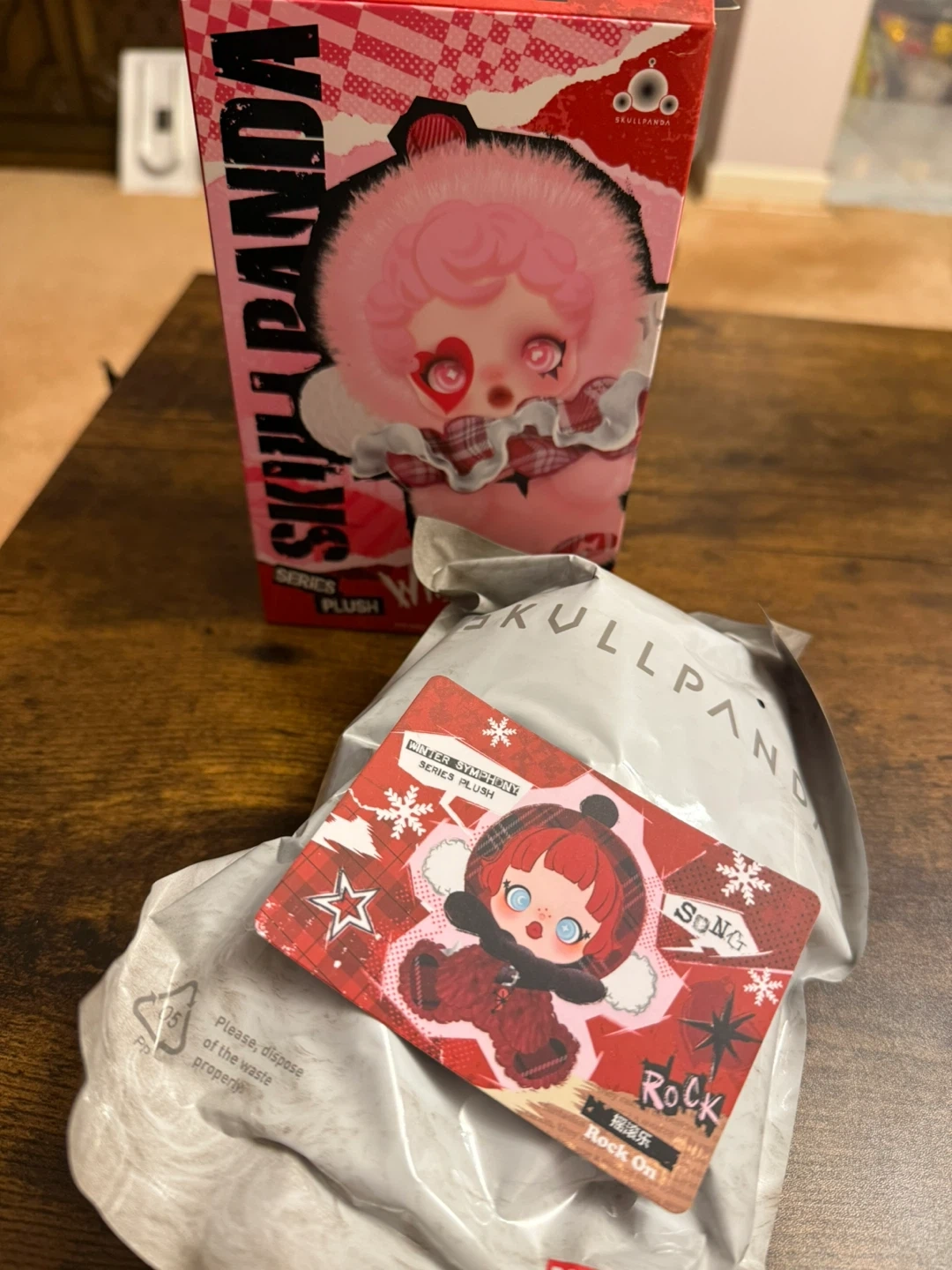 This is a Skullpanda Winter Symphony Series plush toy. It's part of the Rock On collection. This item is a collectible plush.