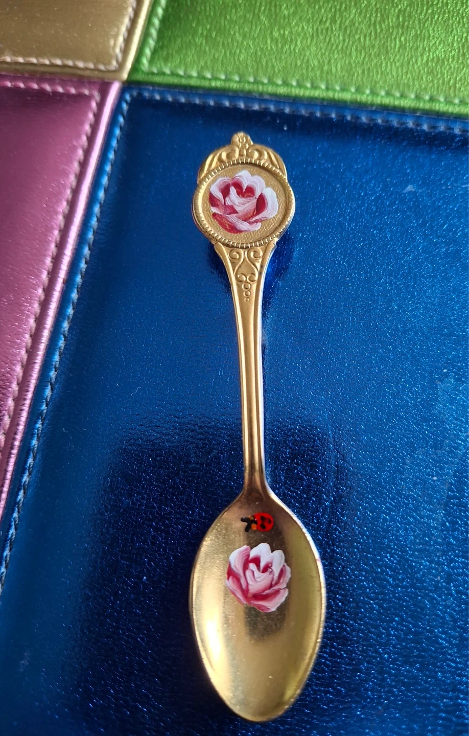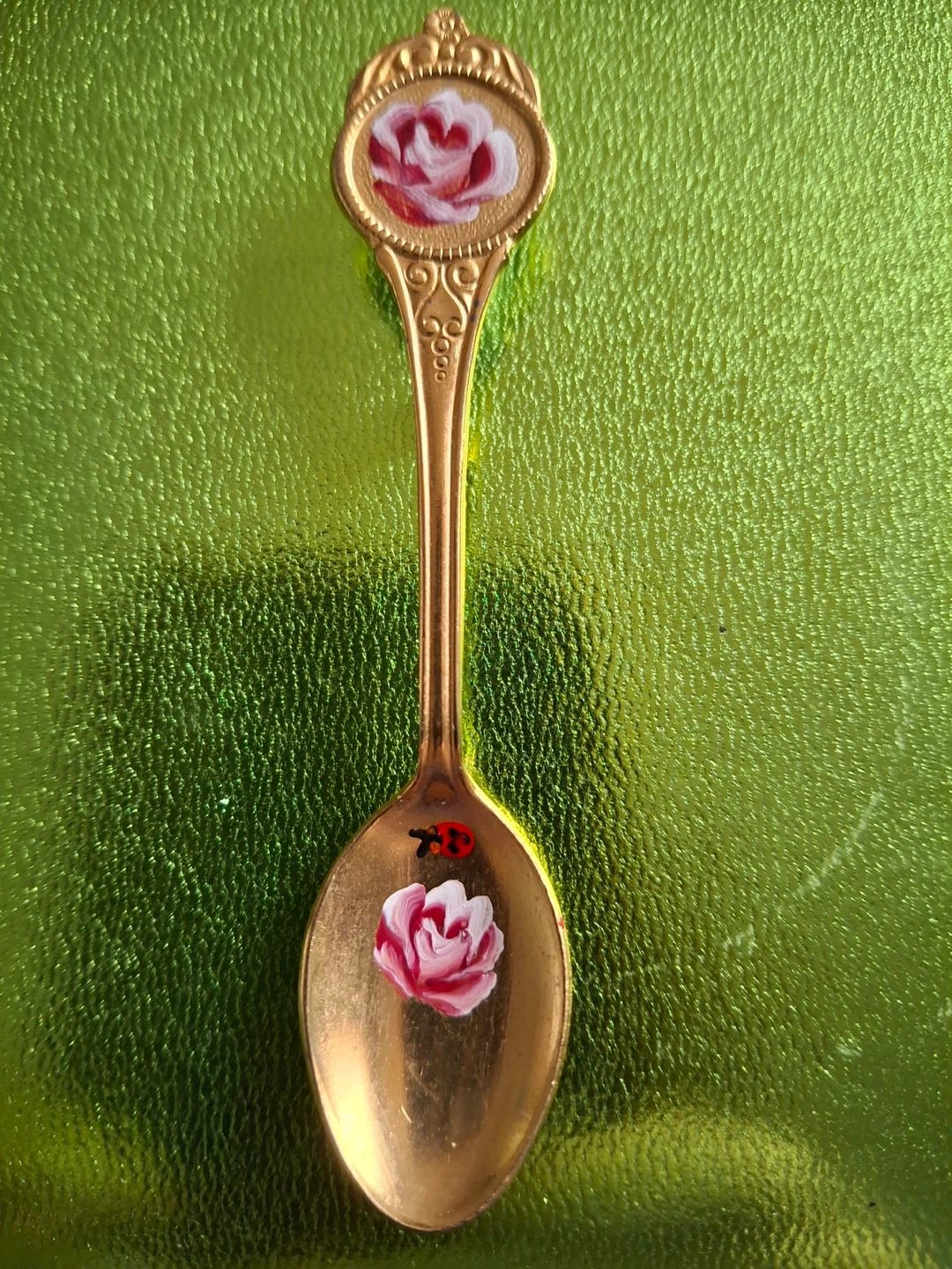 Unique gold coloured spoon pin with painted pink and white flowers and a ladybug. Vintage with no markings on the spoon. 3.25” long.