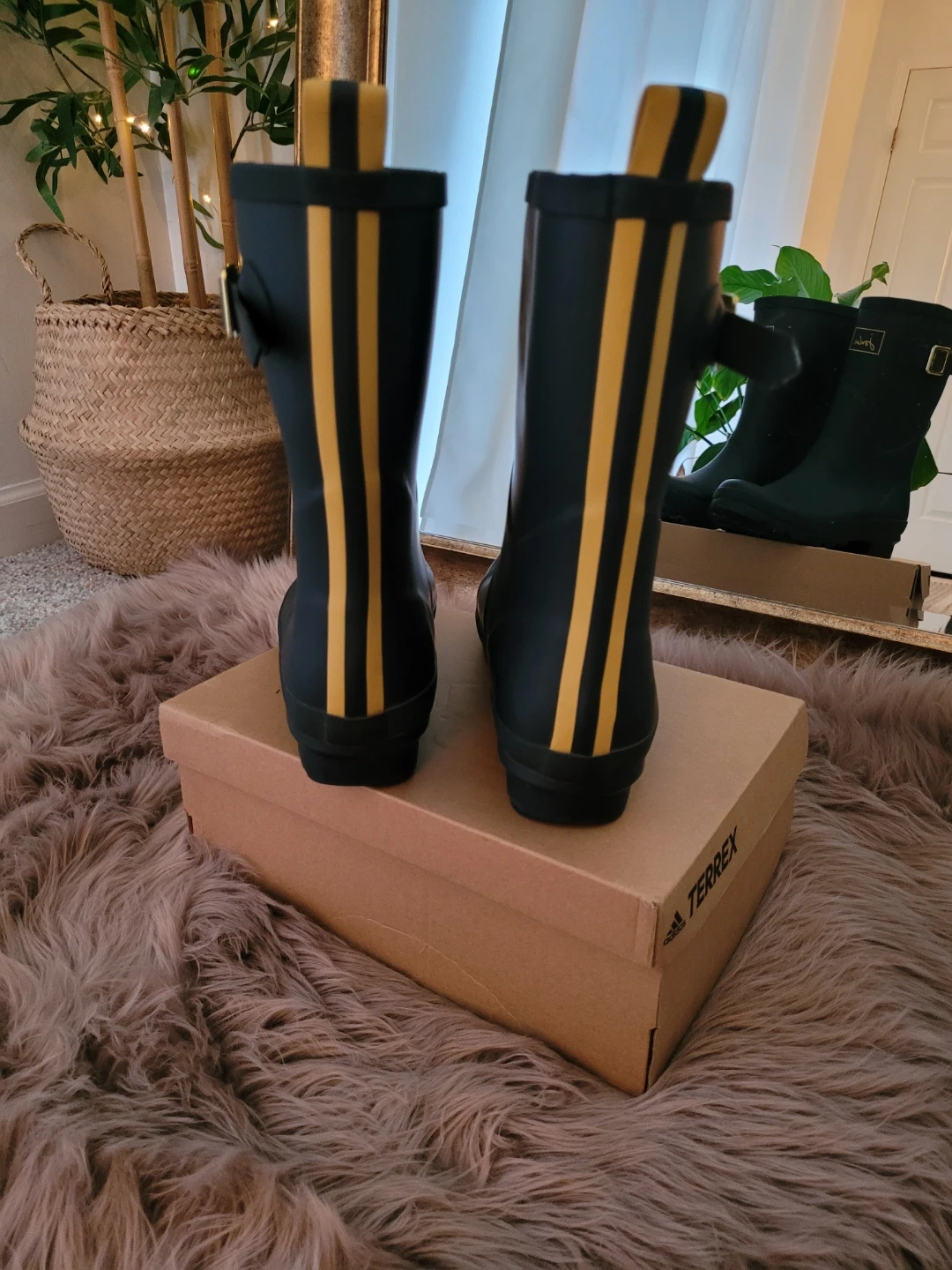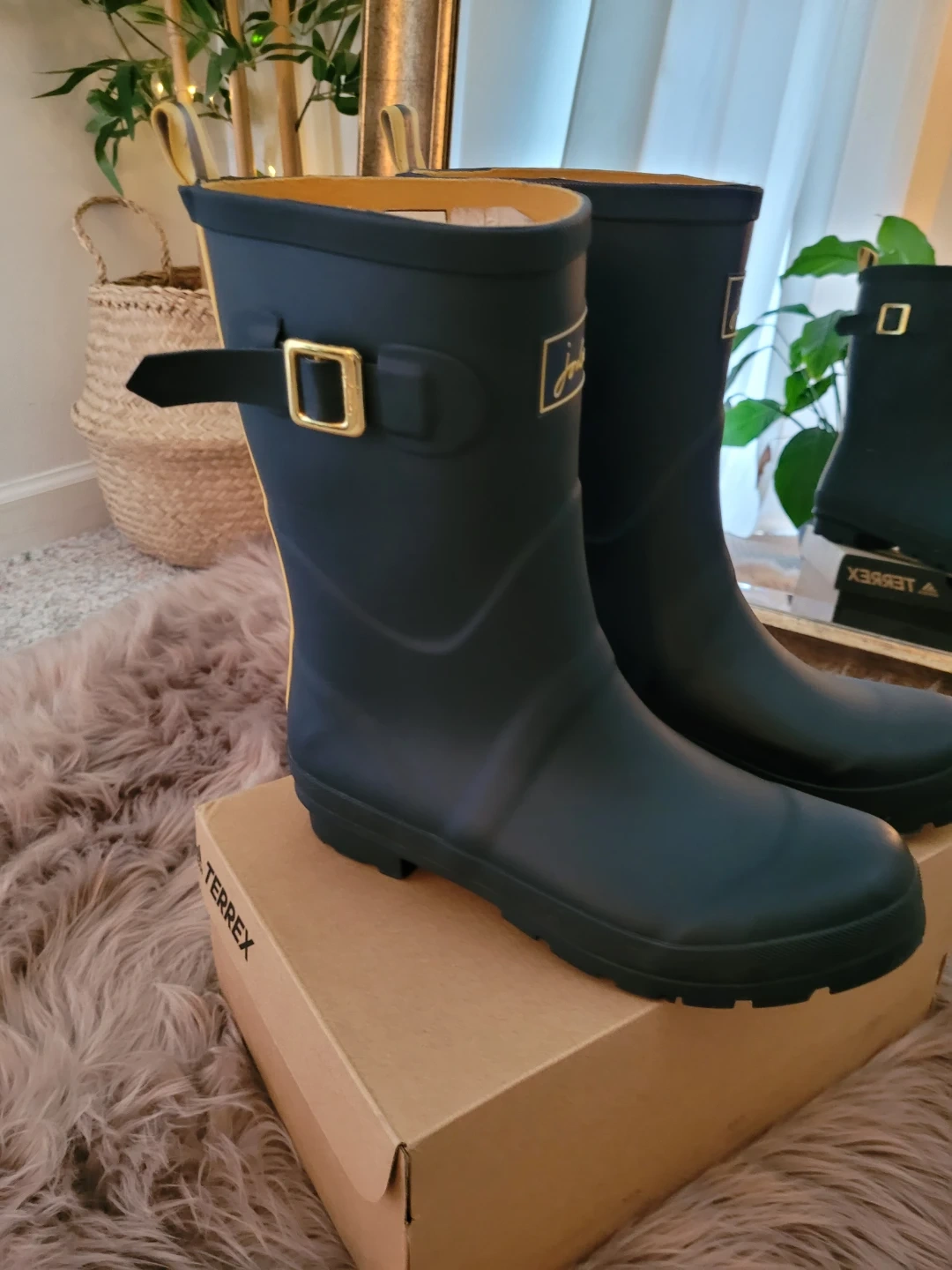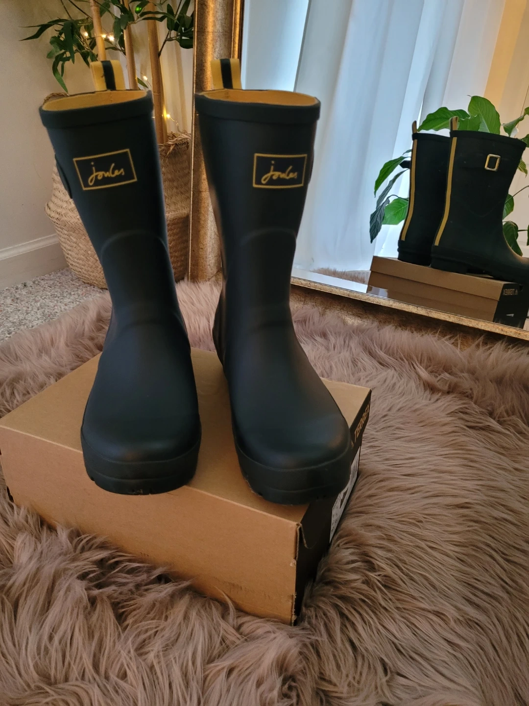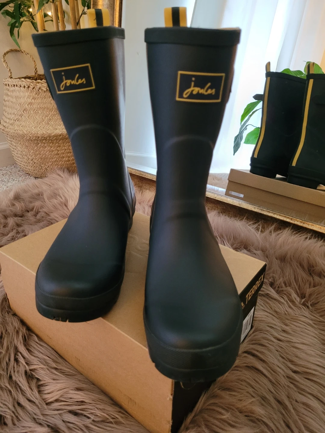 These women's tall rain boots are from Joules. They're navy with yellow trim and a side buckle accent. The boots are made of rubber for durability. They've only been worn a few times and are in very good condition.