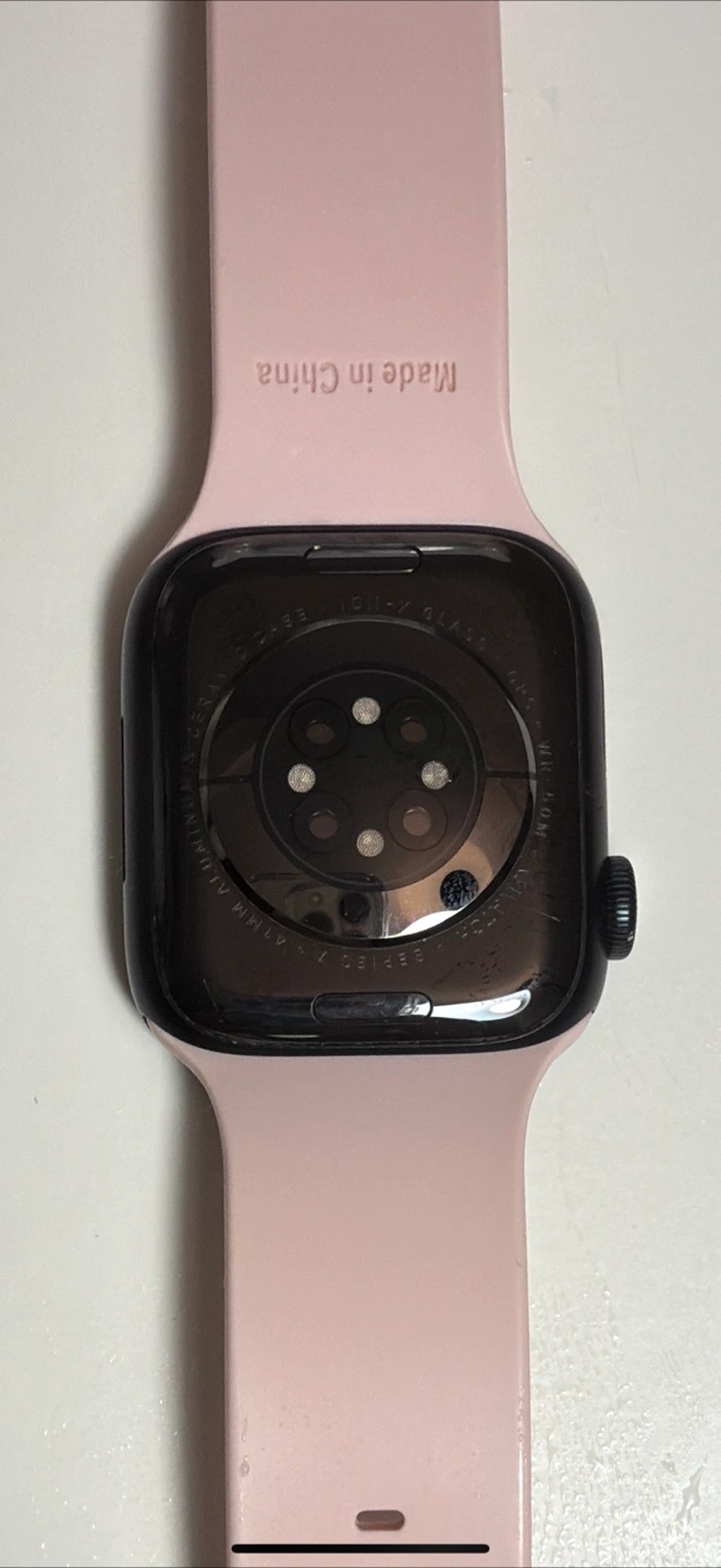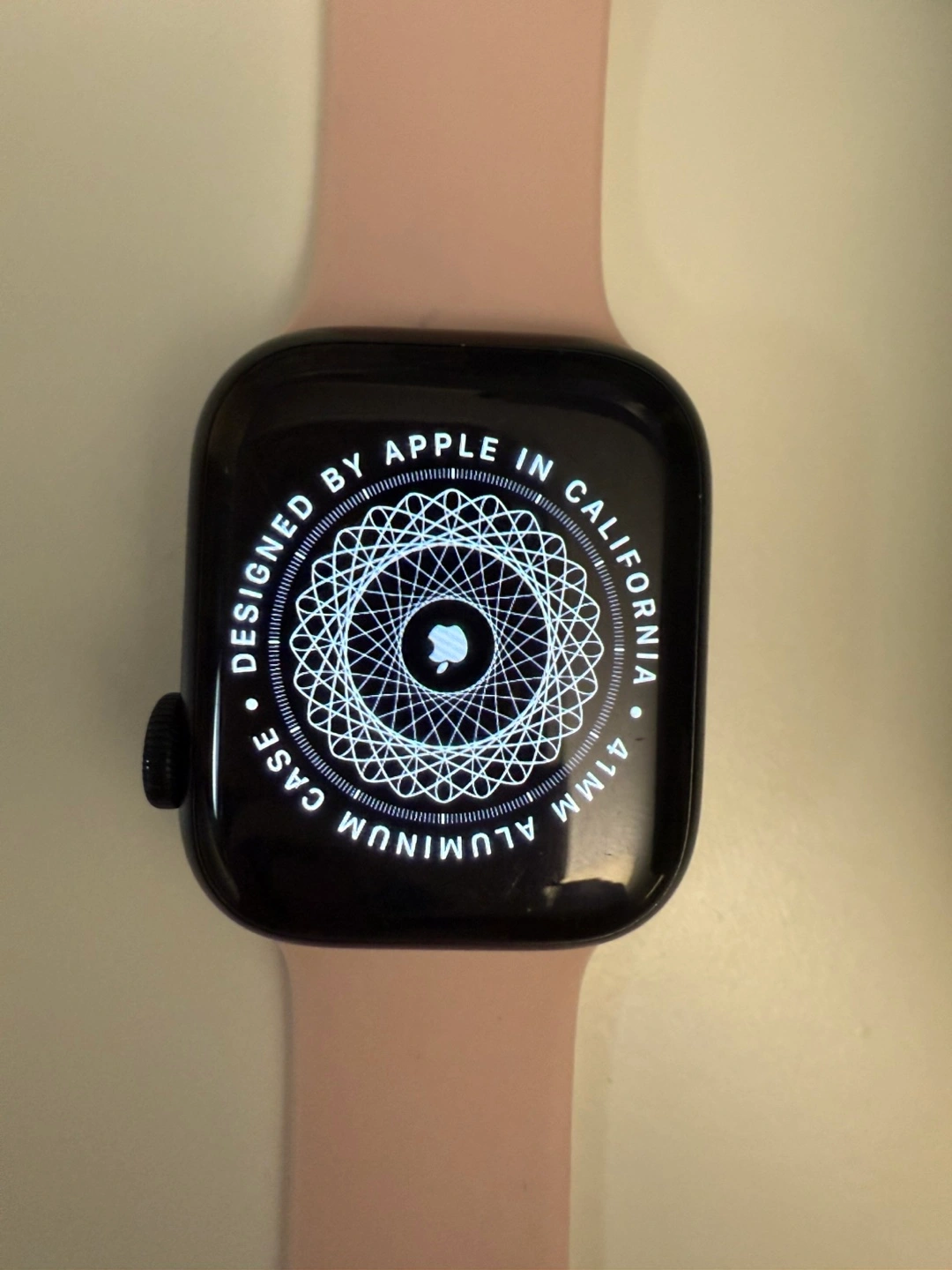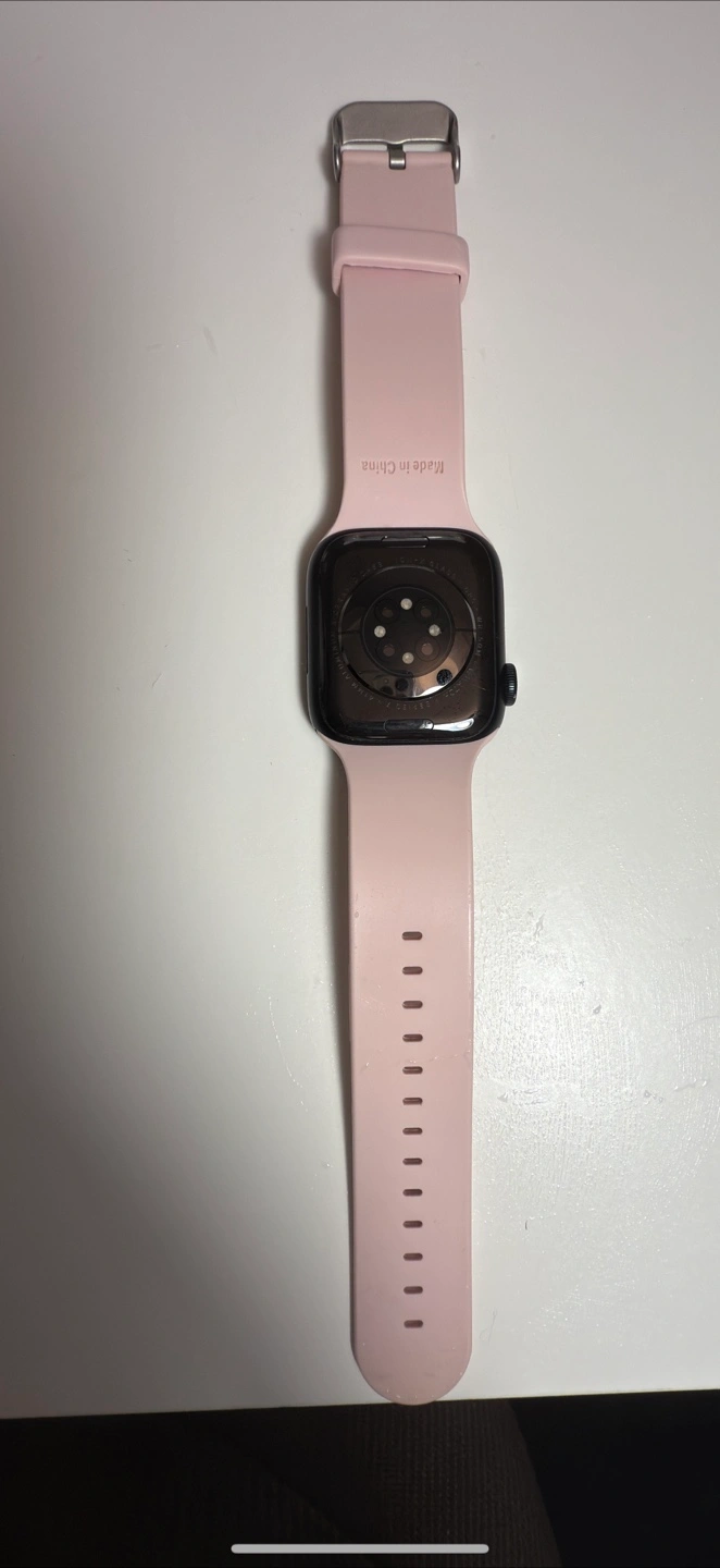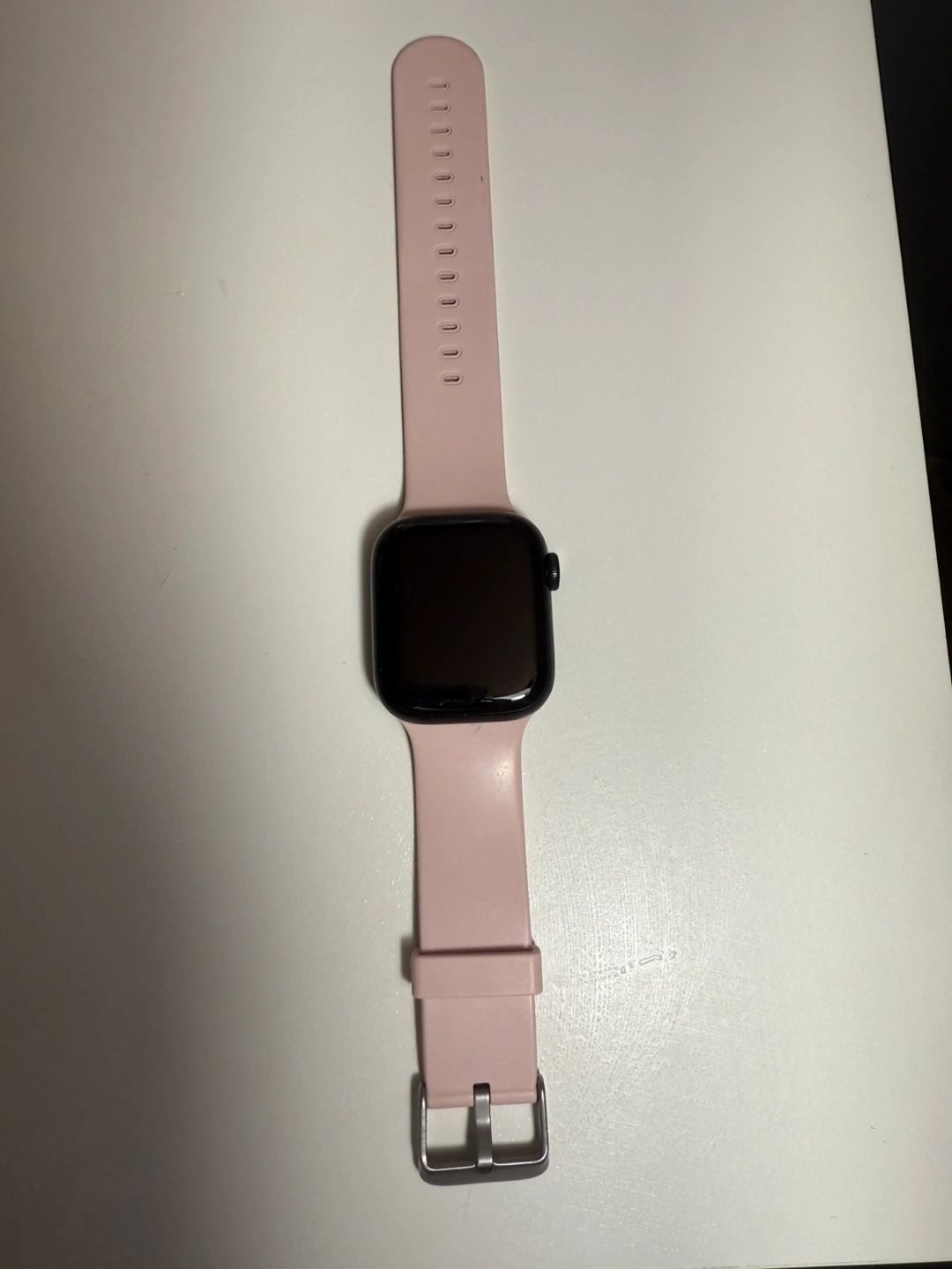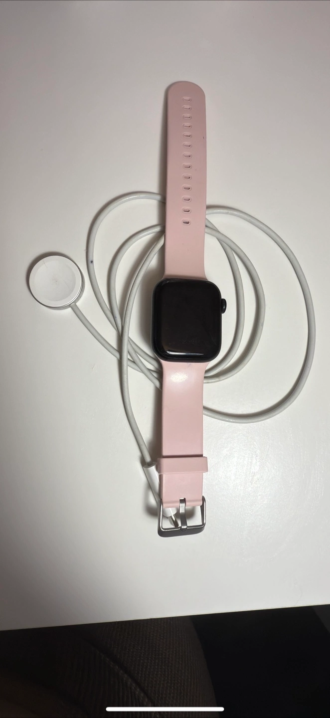 Selling an Apple Watch Series 7 with a 41mm aluminum case. It comes with a pink band and a charger. The watch is in great condition and ready for a new owner!