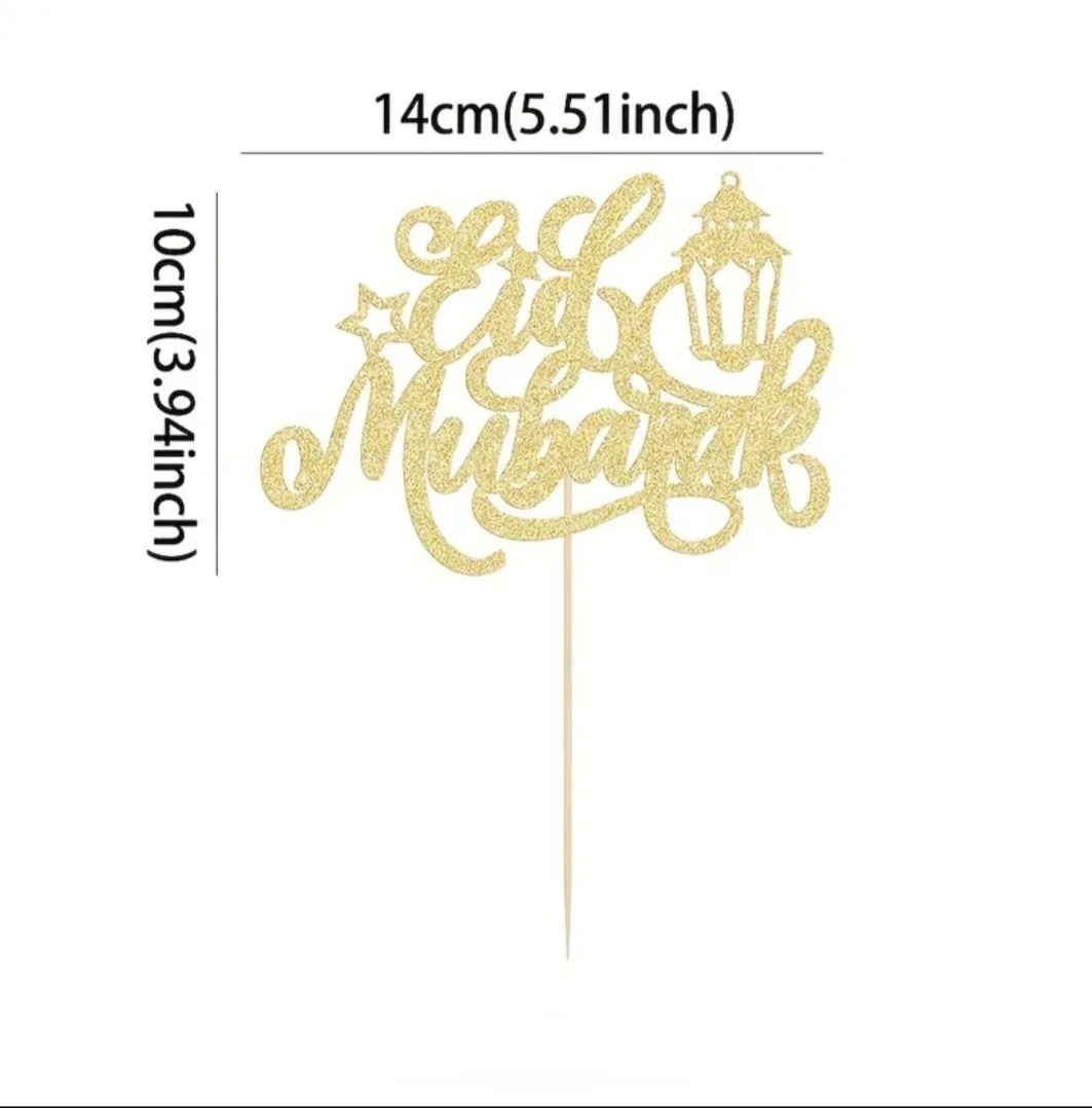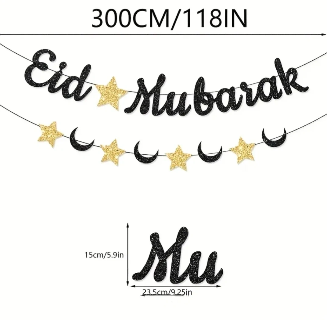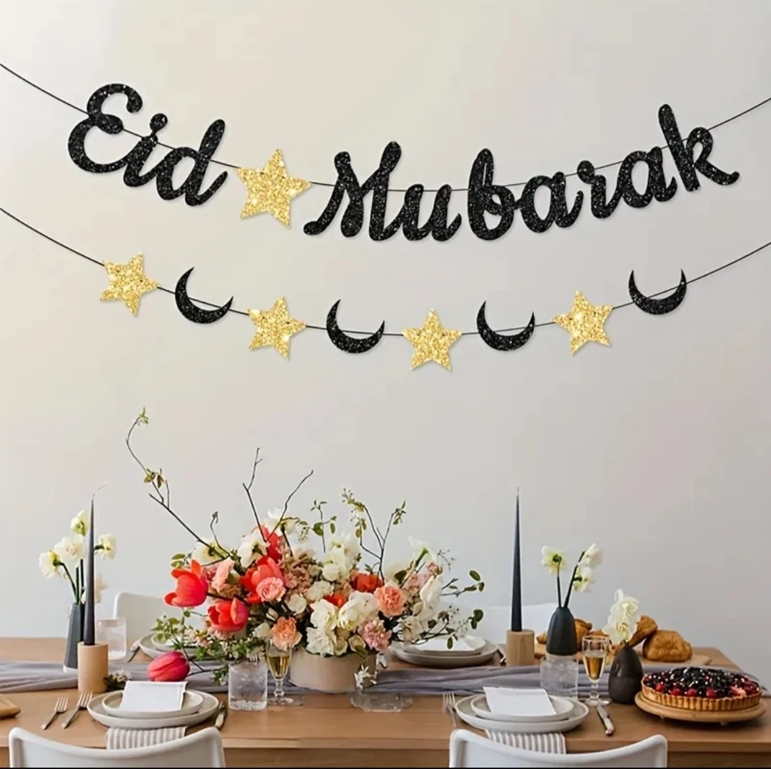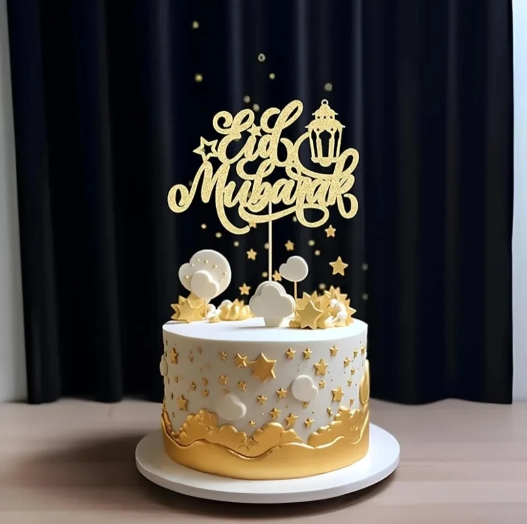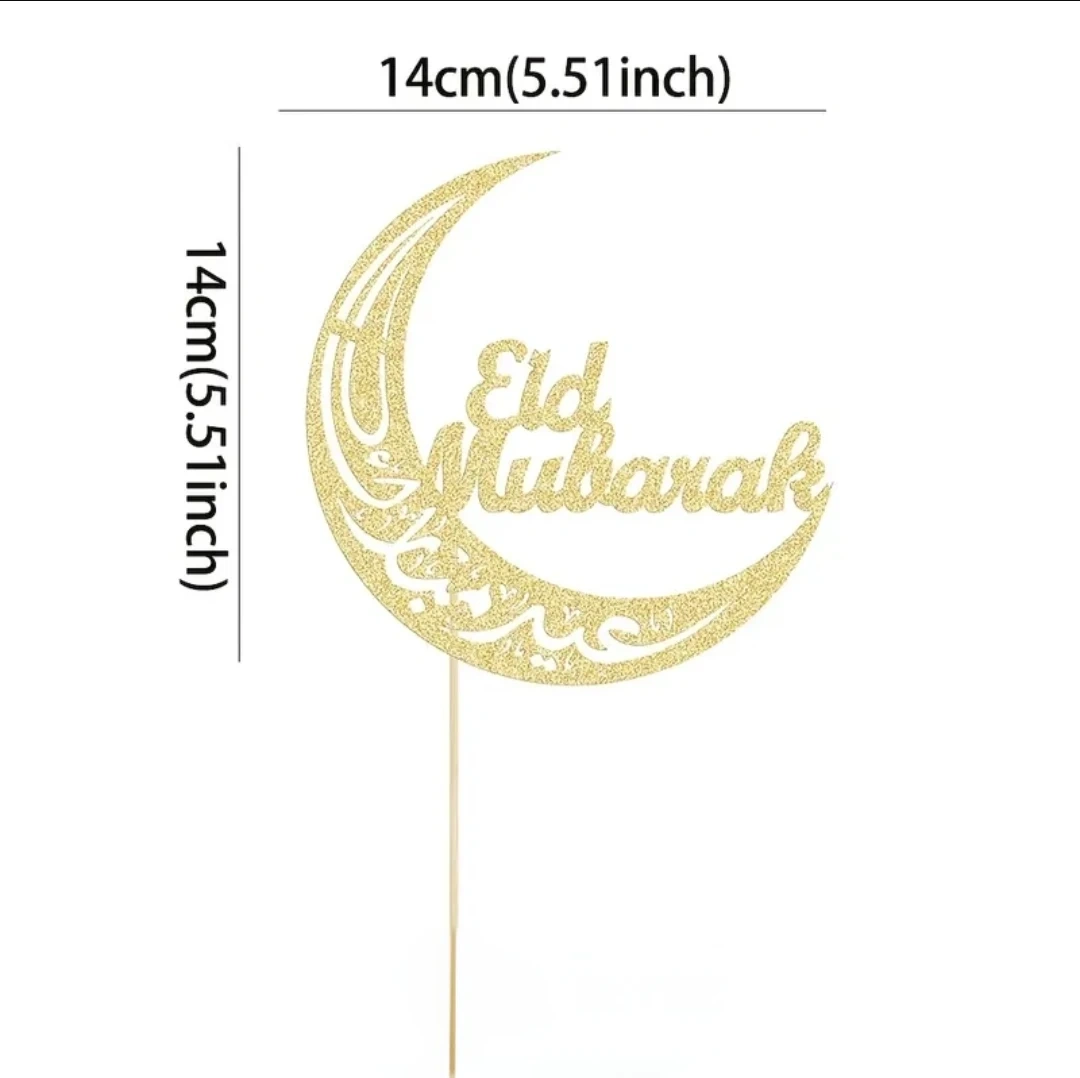 This set includes a sparkly "Eid Mubarak" cake topper and a "Eid Mubarak" banner with stars and moons.