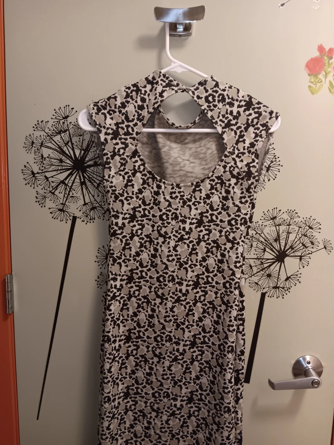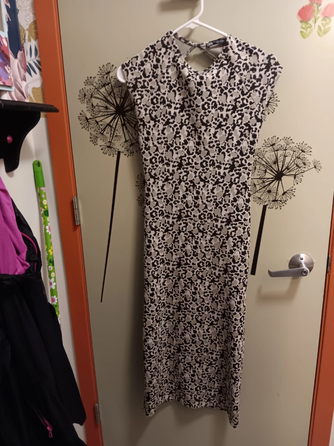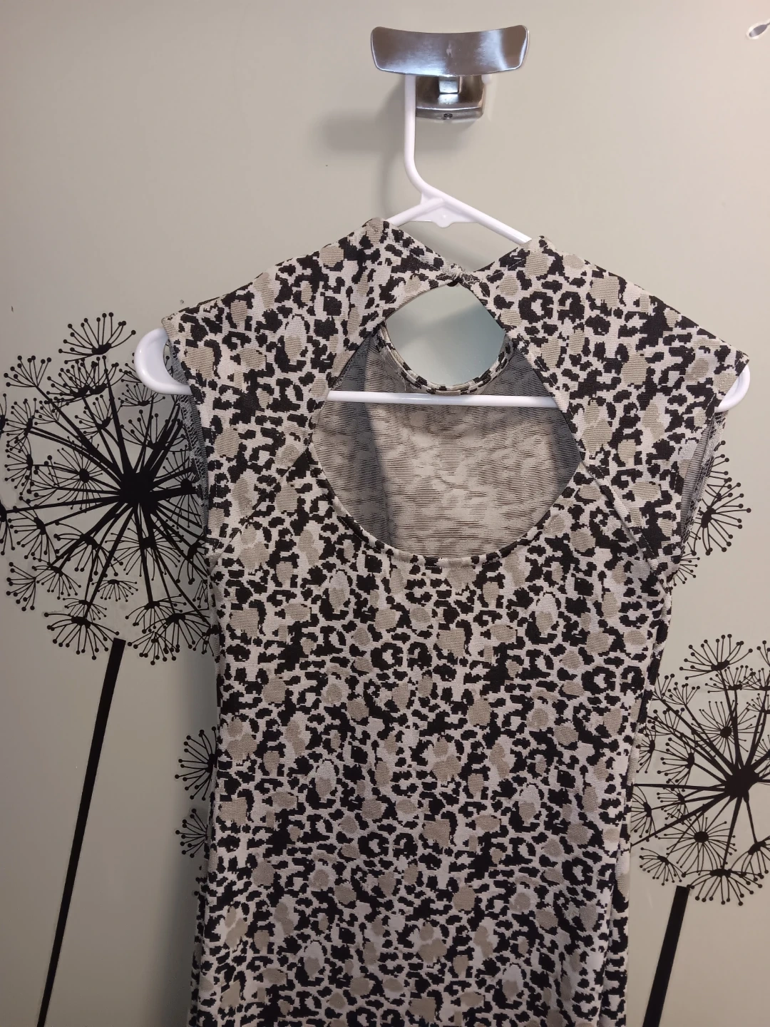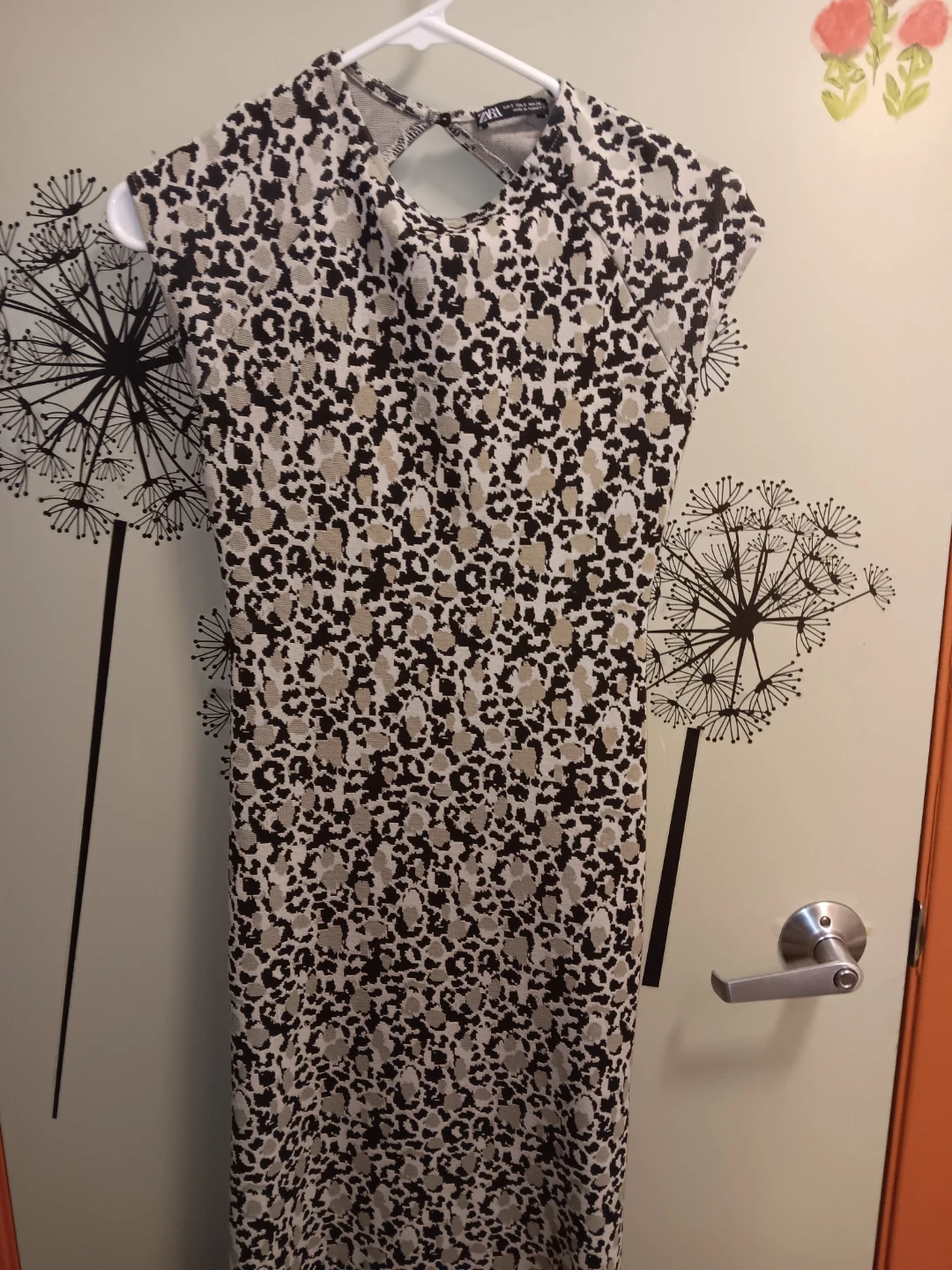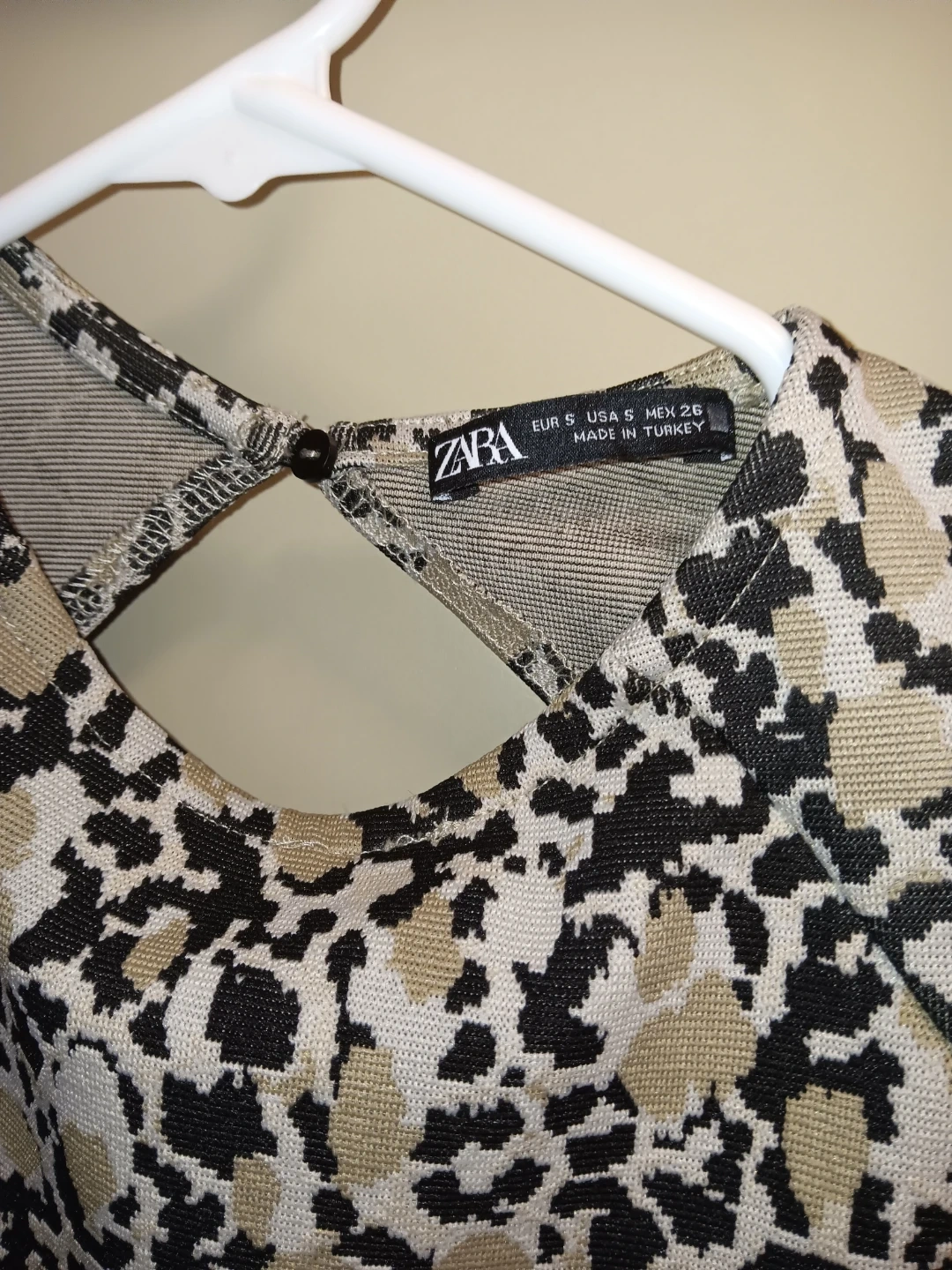 This is a ZARA cap sleeve top with a leopard print. It's a size small. The back features a cut-out detail. Beautiful, Super flattering and versatile dress@!