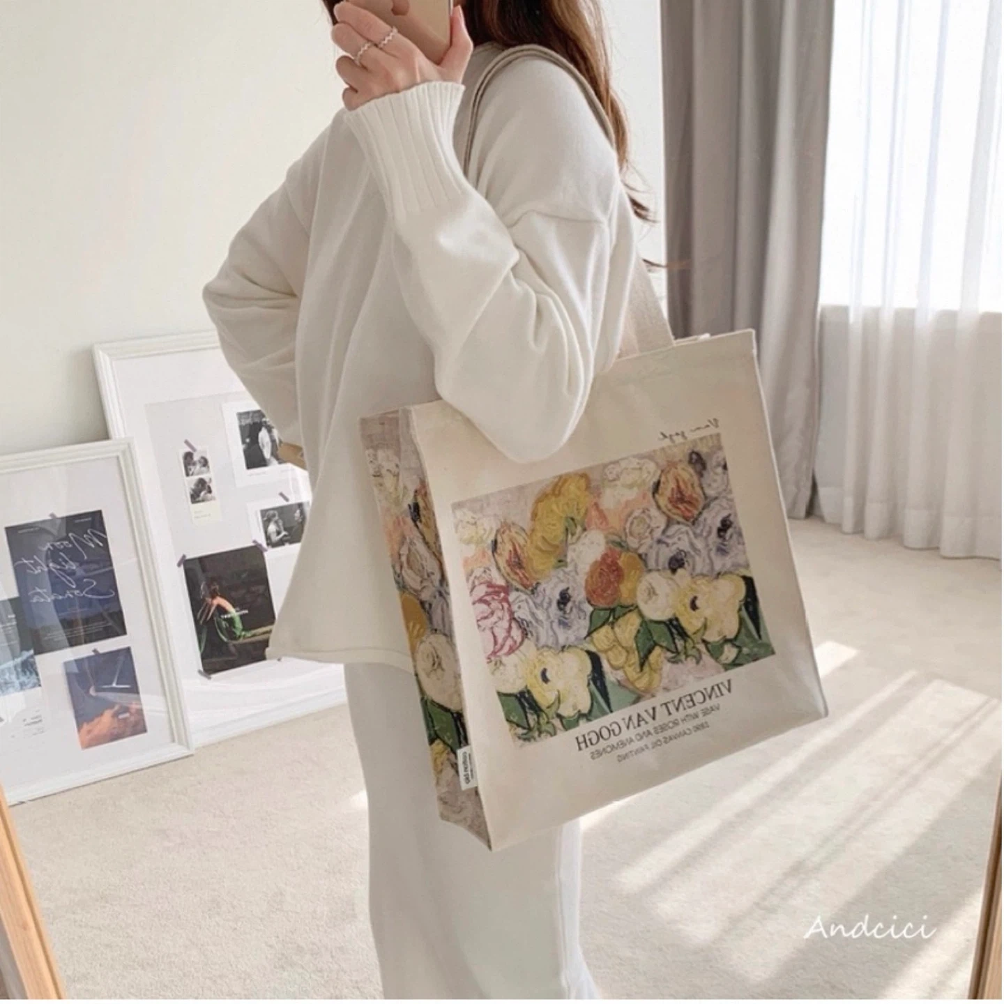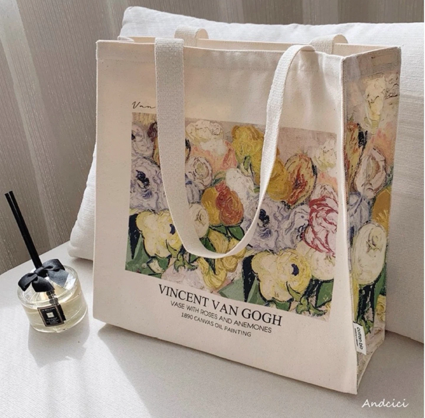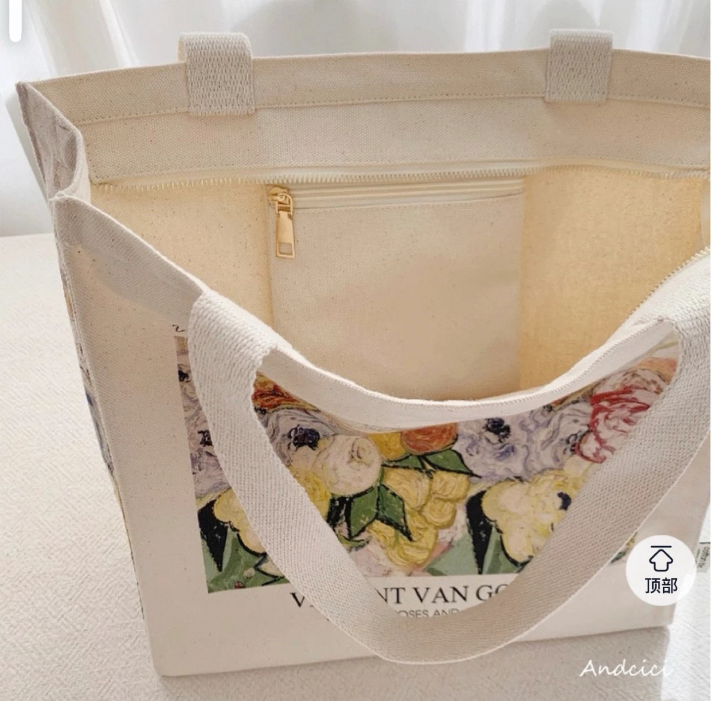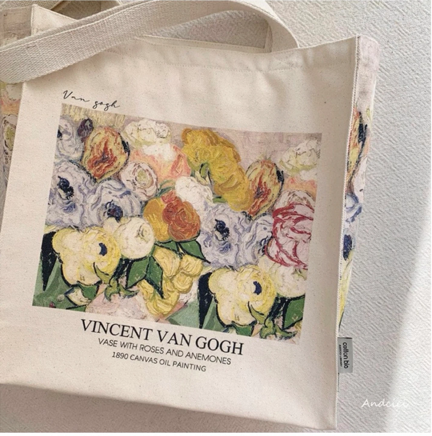 Canvas tote bag featuring Vincent Van Gogh's 'Vase with Roses and Anemones', painted in 1890. It's made of durable canvas and includes an interior zippered pocket. This bag is great for everyday use!