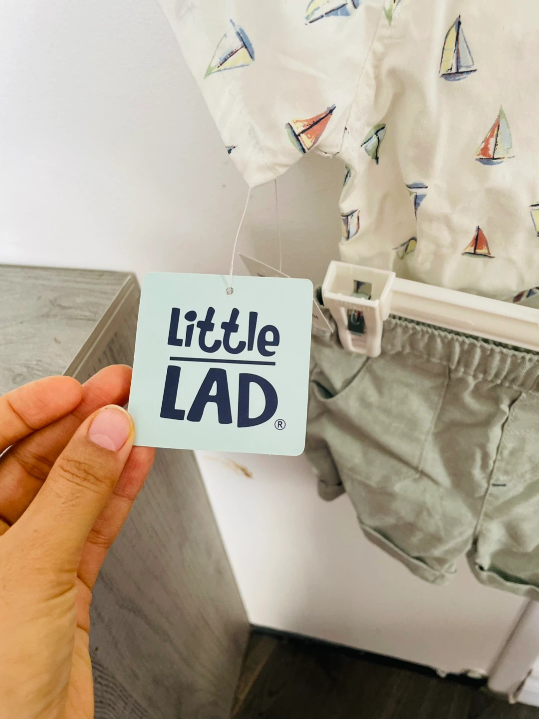 This is a 3-piece set from Little Lad featuring a sailor print short-sleeve shirt, matching shorts, and a bow tie. The shirt is white with a sailboat pattern. The shorts are a light green colour. It's perfect for warmer weather occasions!