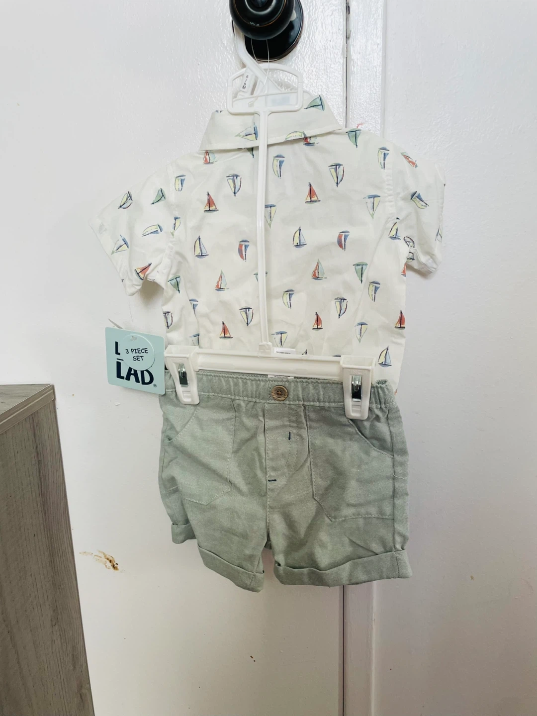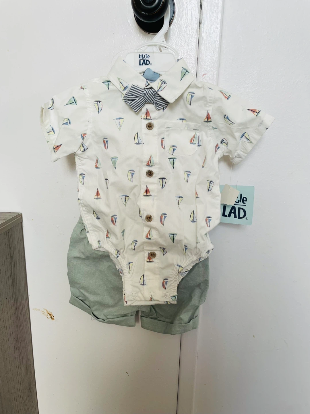 This is a 3-piece set from Little Lad featuring a sailor print short-sleeve shirt, matching shorts, and a bow tie. The shirt is white with a sailboat pattern. The shorts are a light green colour. It's perfect for warmer weather occasions!