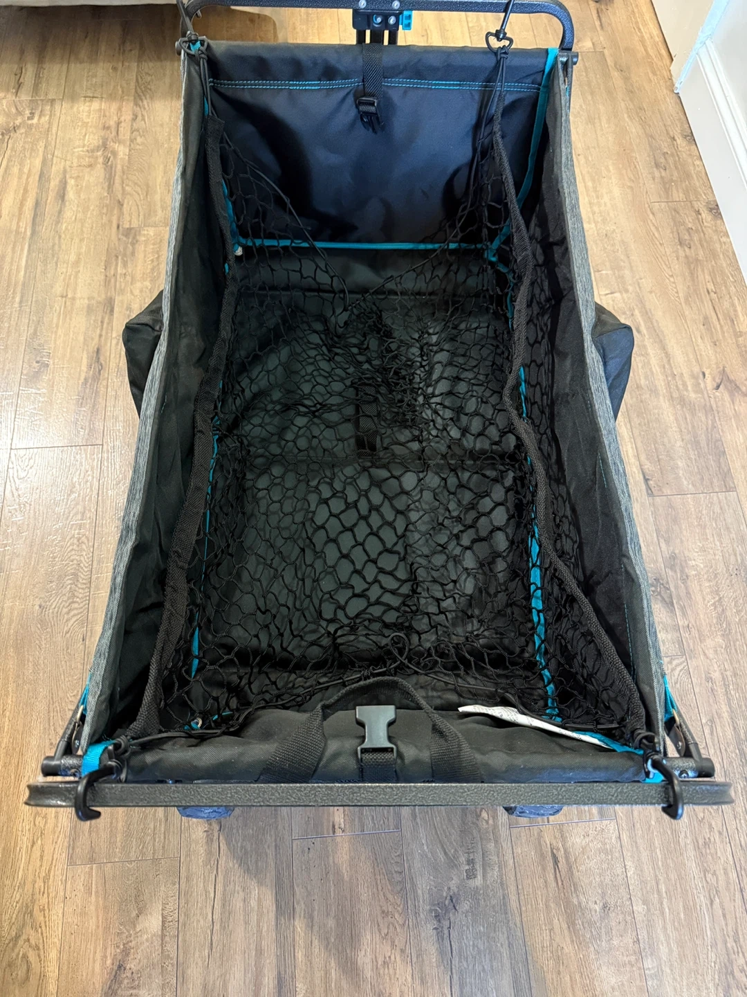 This is a folding utility wagon perfect for hauling gear. It features a durable fabric and a sturdy metal frame. The wagon includes a handle for easy towing and multiple mesh pockets for storage. It's great for camping trips, beach days, or backyard adventures!used only twice at the beach