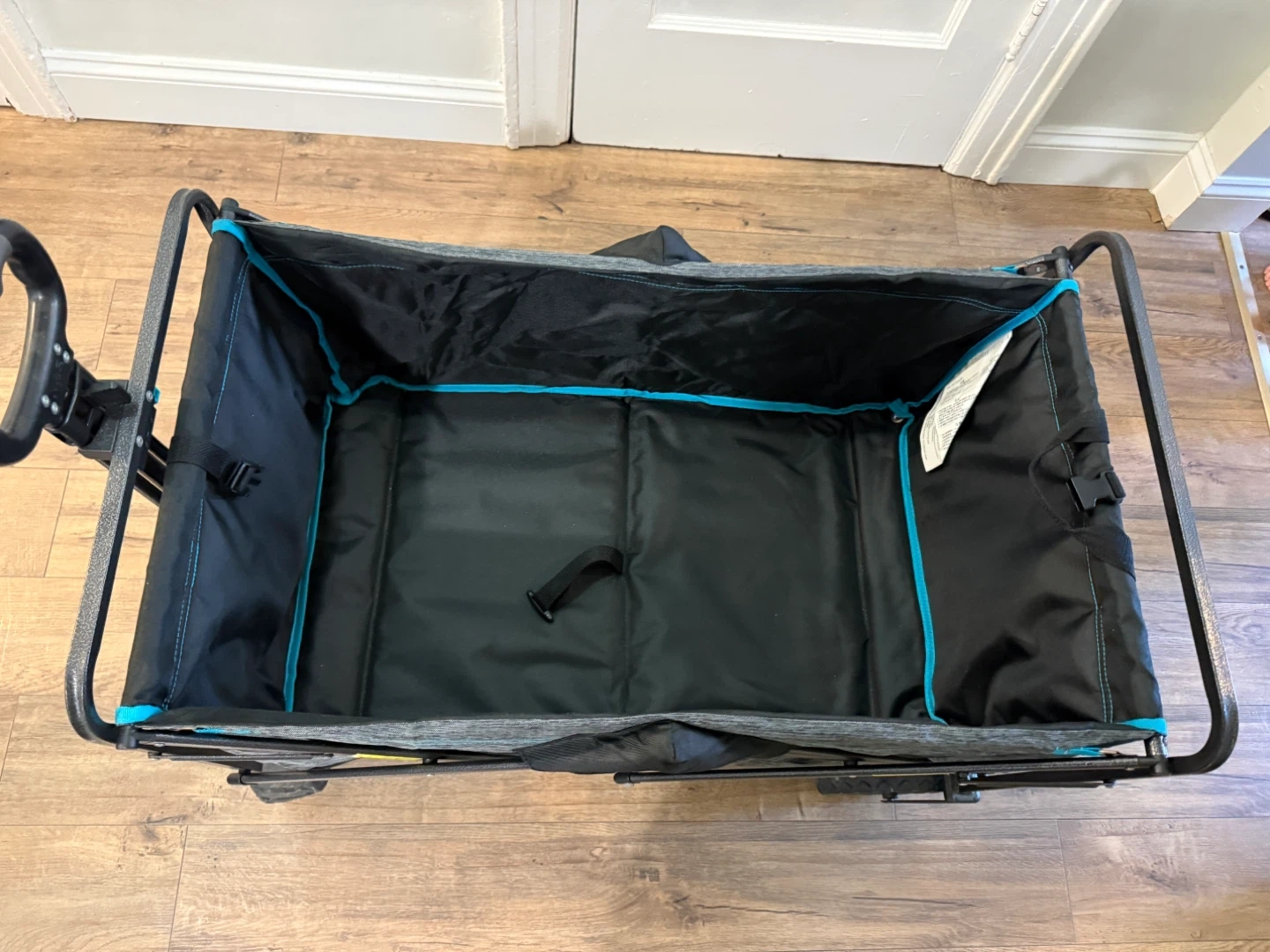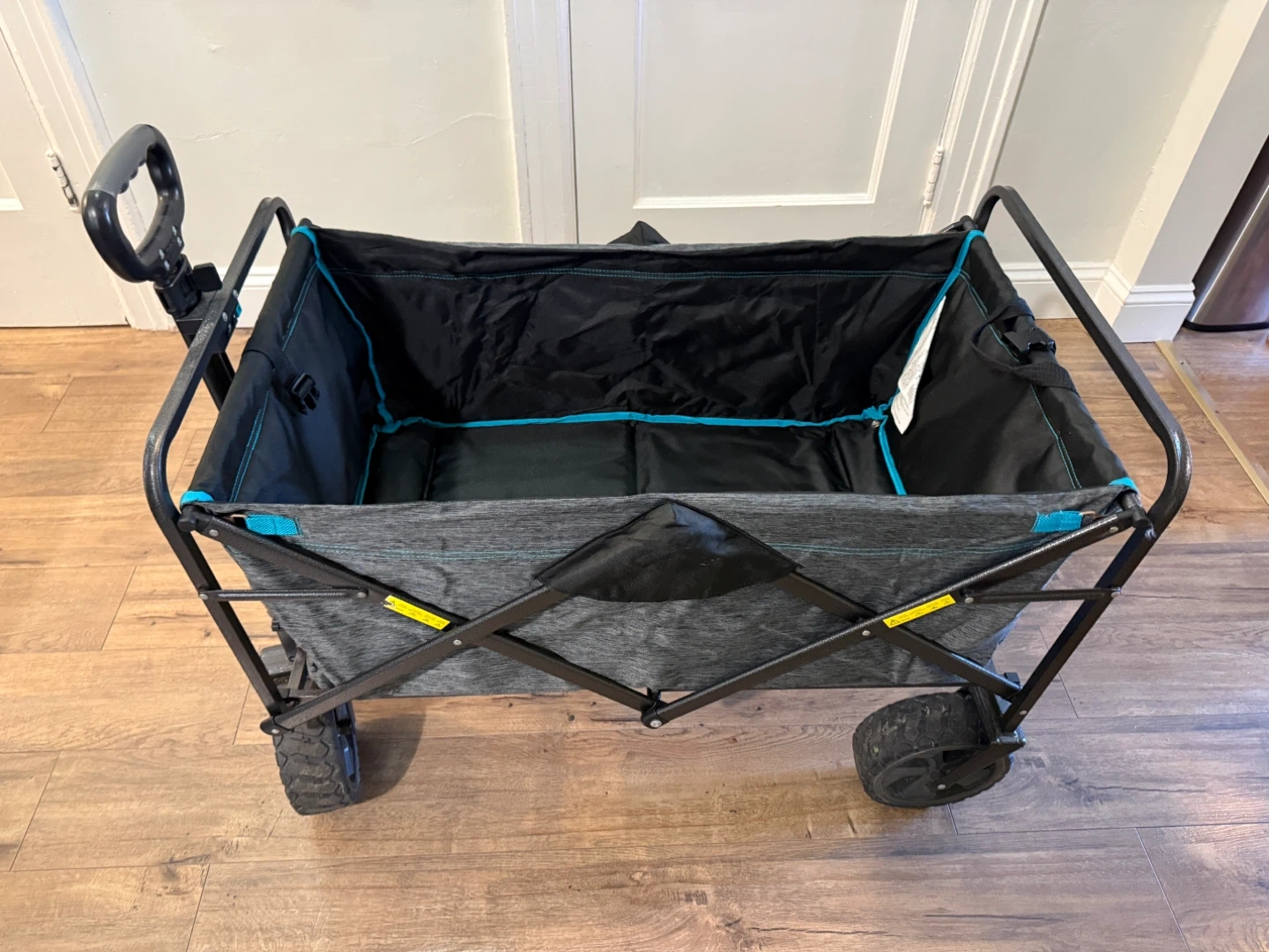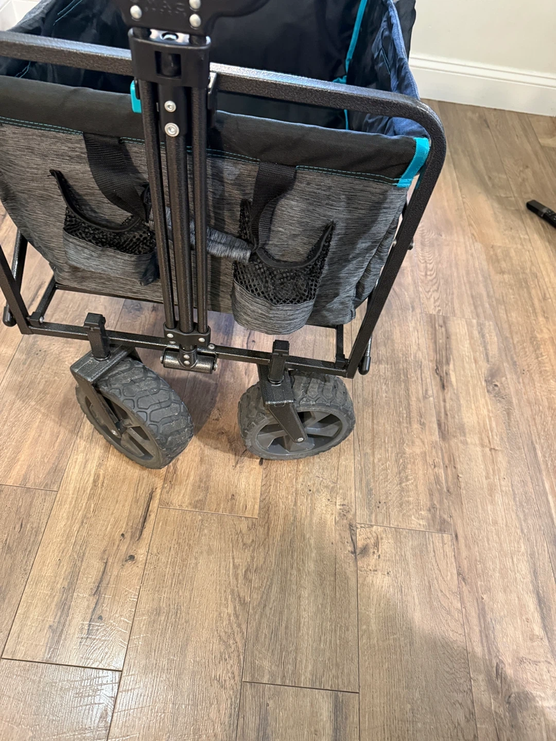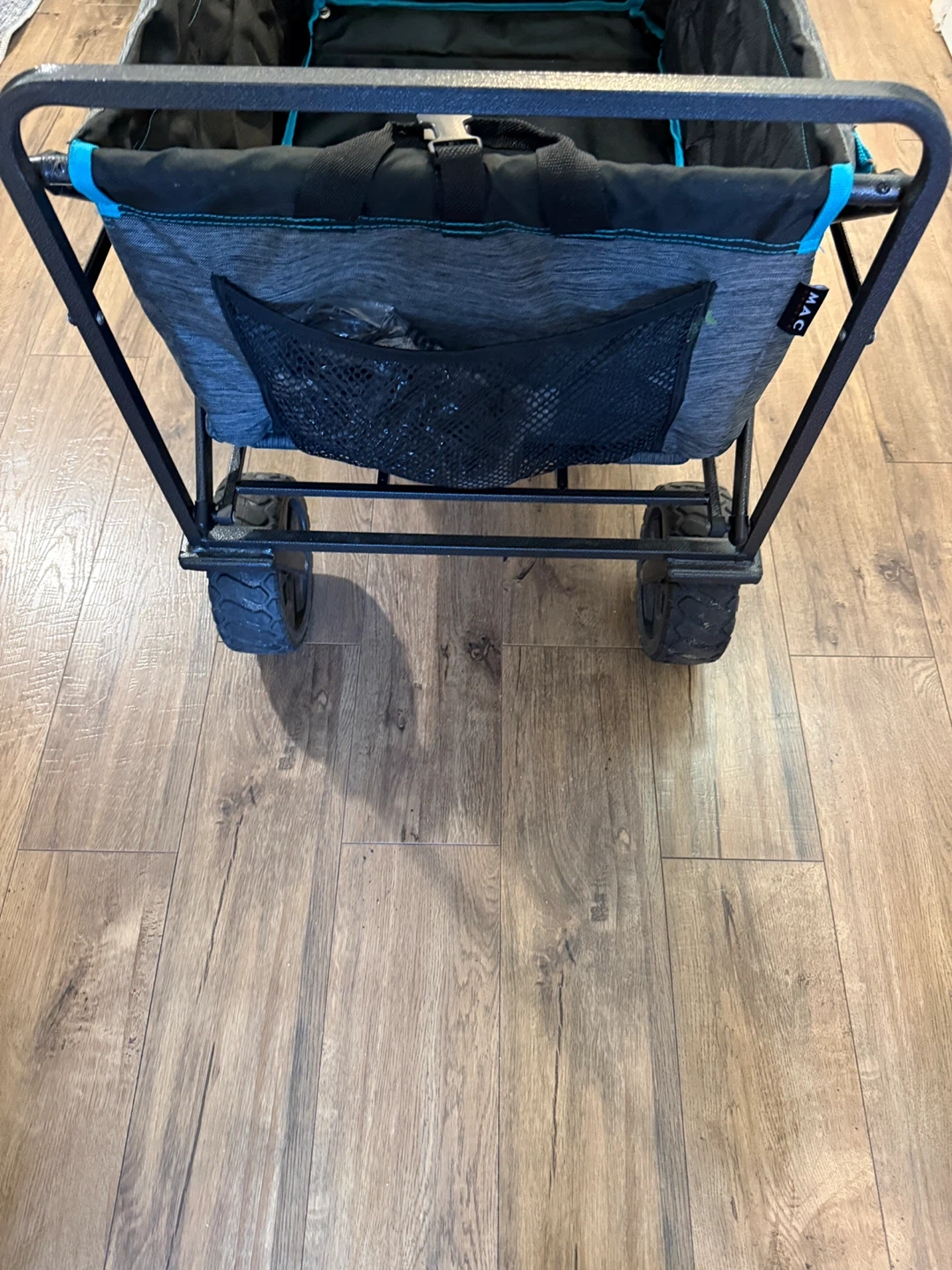 This is a folding utility wagon perfect for hauling gear. It features a durable fabric and a sturdy metal frame. The wagon includes a handle for easy towing and multiple mesh pockets for storage. It's great for camping trips, beach days, or backyard adventures!used only twice at the beach