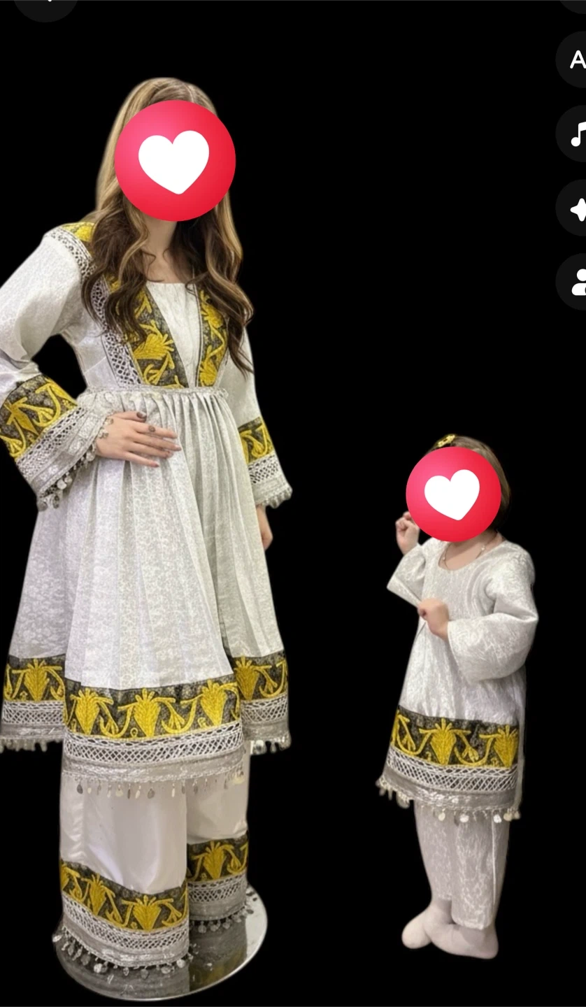 Beautiful matching Afghan dresses for mother and daughter. The dresses are white with gold and black embroidery. Perfect for special occasions or cultural events!