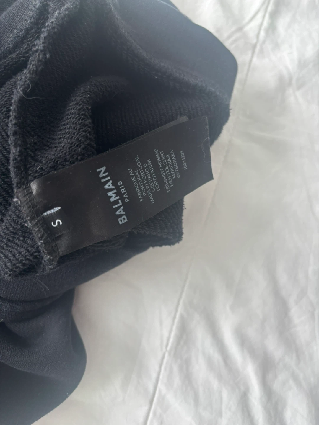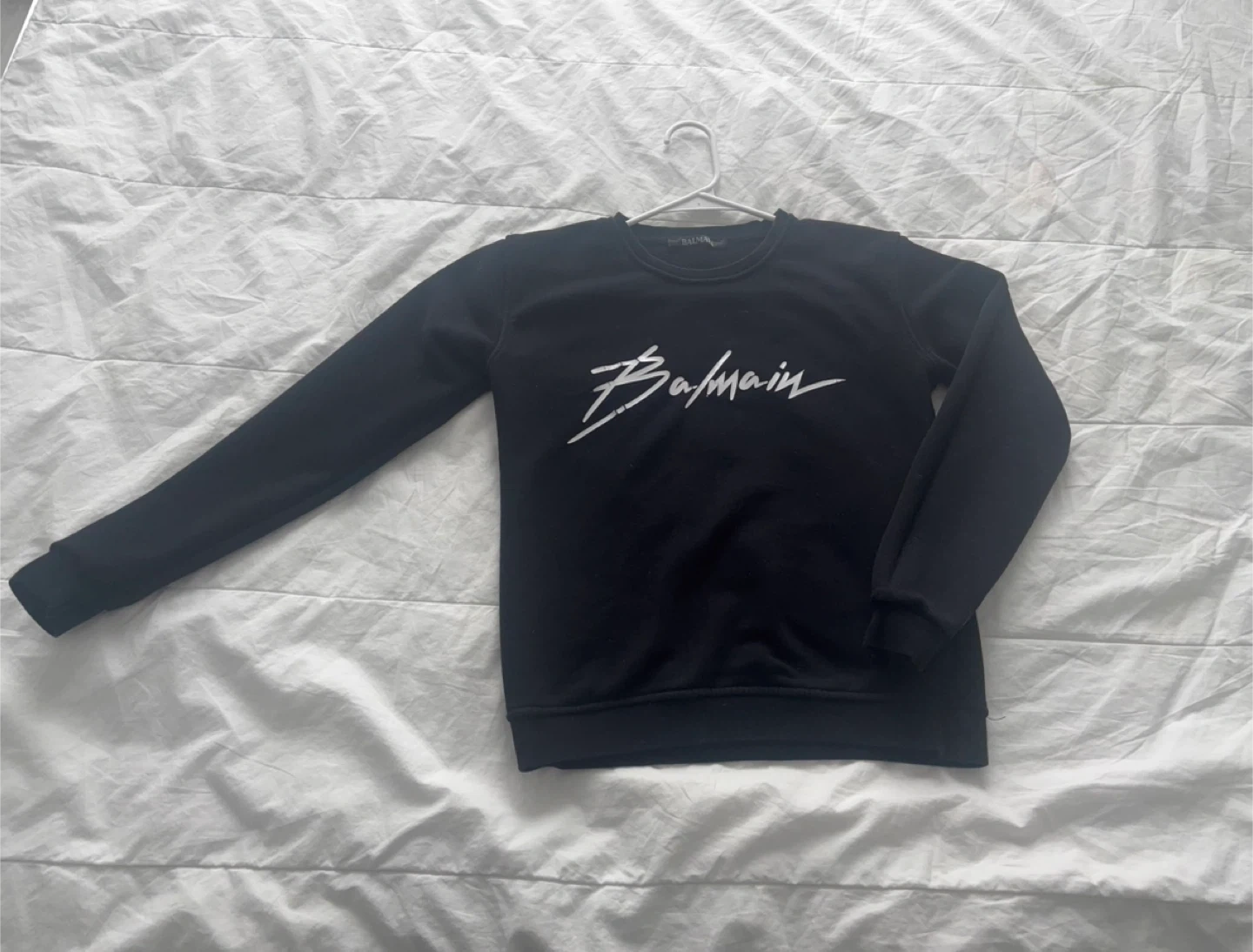 Balmain Paris crewneck sweatshirt in black. Features a large, stylized Balmain logo across the front. Made in Portugal.