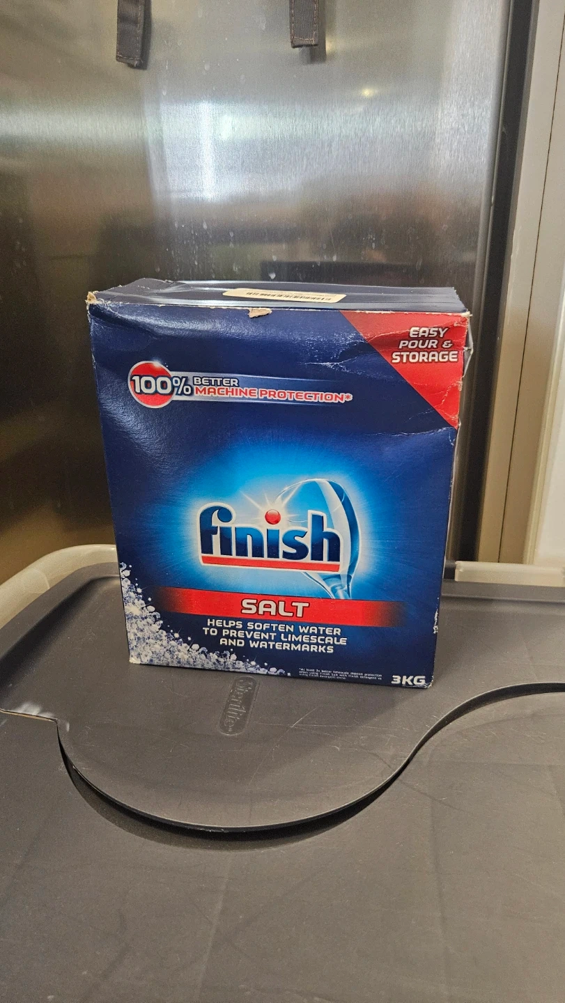 This is a 3kg box of Finish Salt for dishwashers. It helps soften water to prevent limescale and watermarks. It's designed for easy pour and storage. This salt is essential for maintaining your dishwasher's performance!