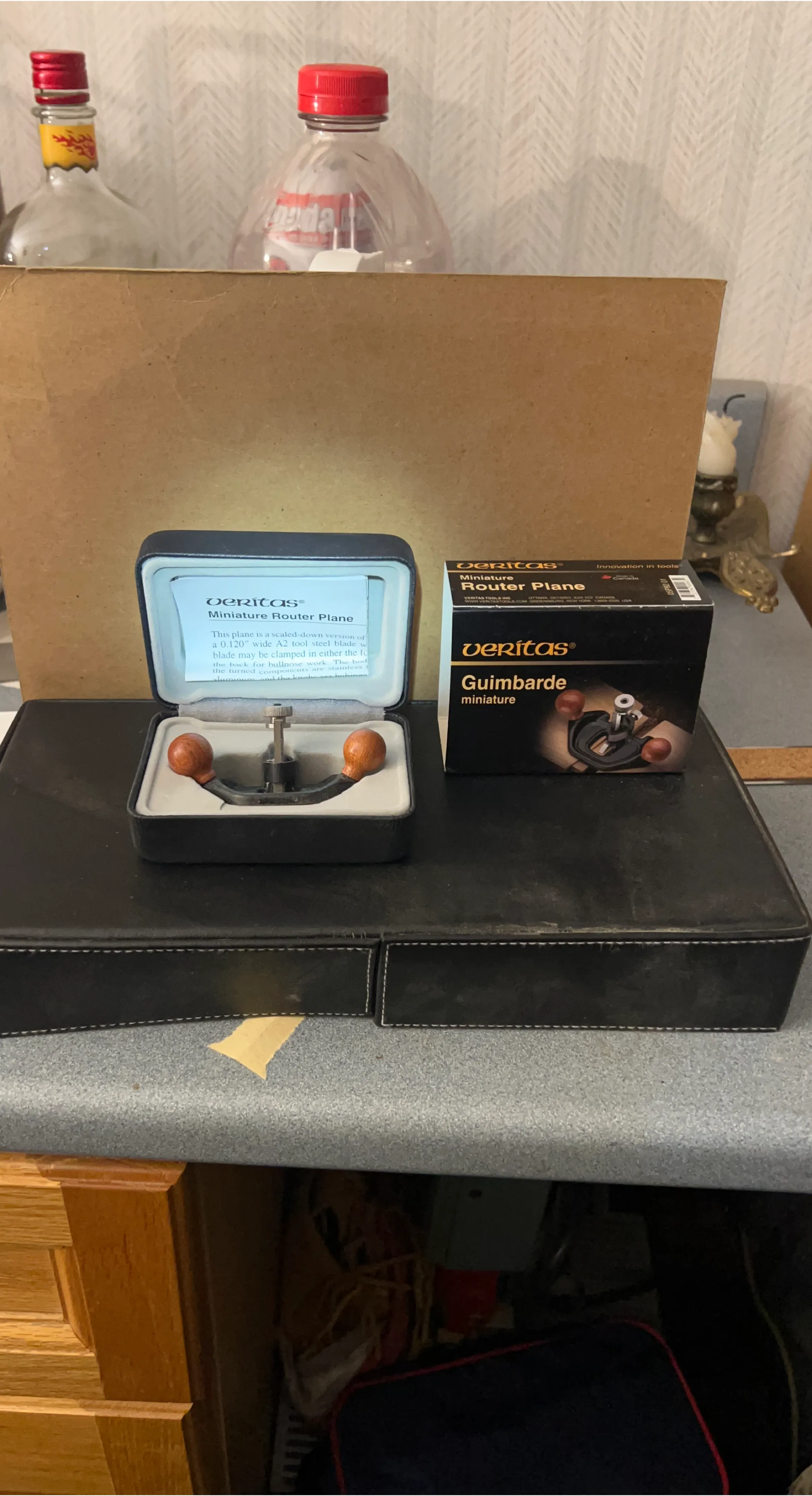 This is a Veritas Miniature Router Plane, a scaled-down version of a 0.120" wide A2 tool steel blade. It includes the box and case. The turned components are brass.