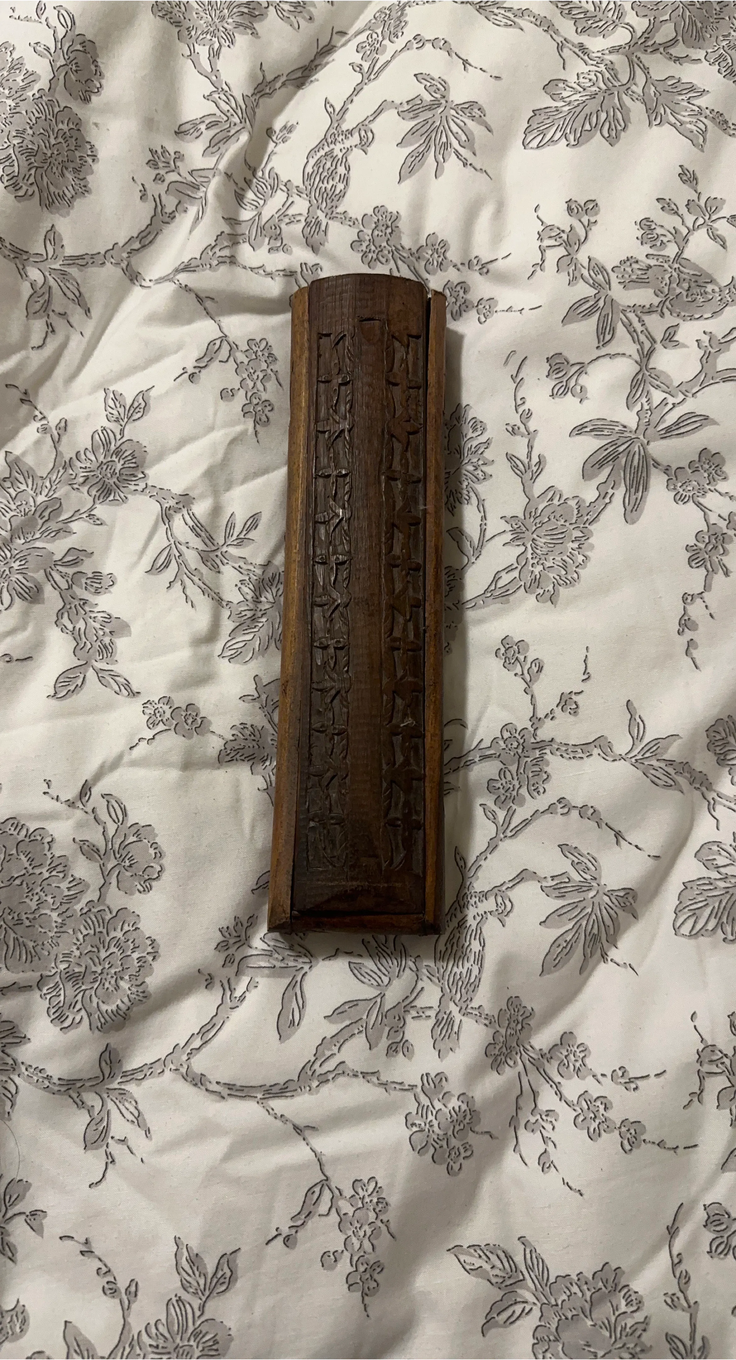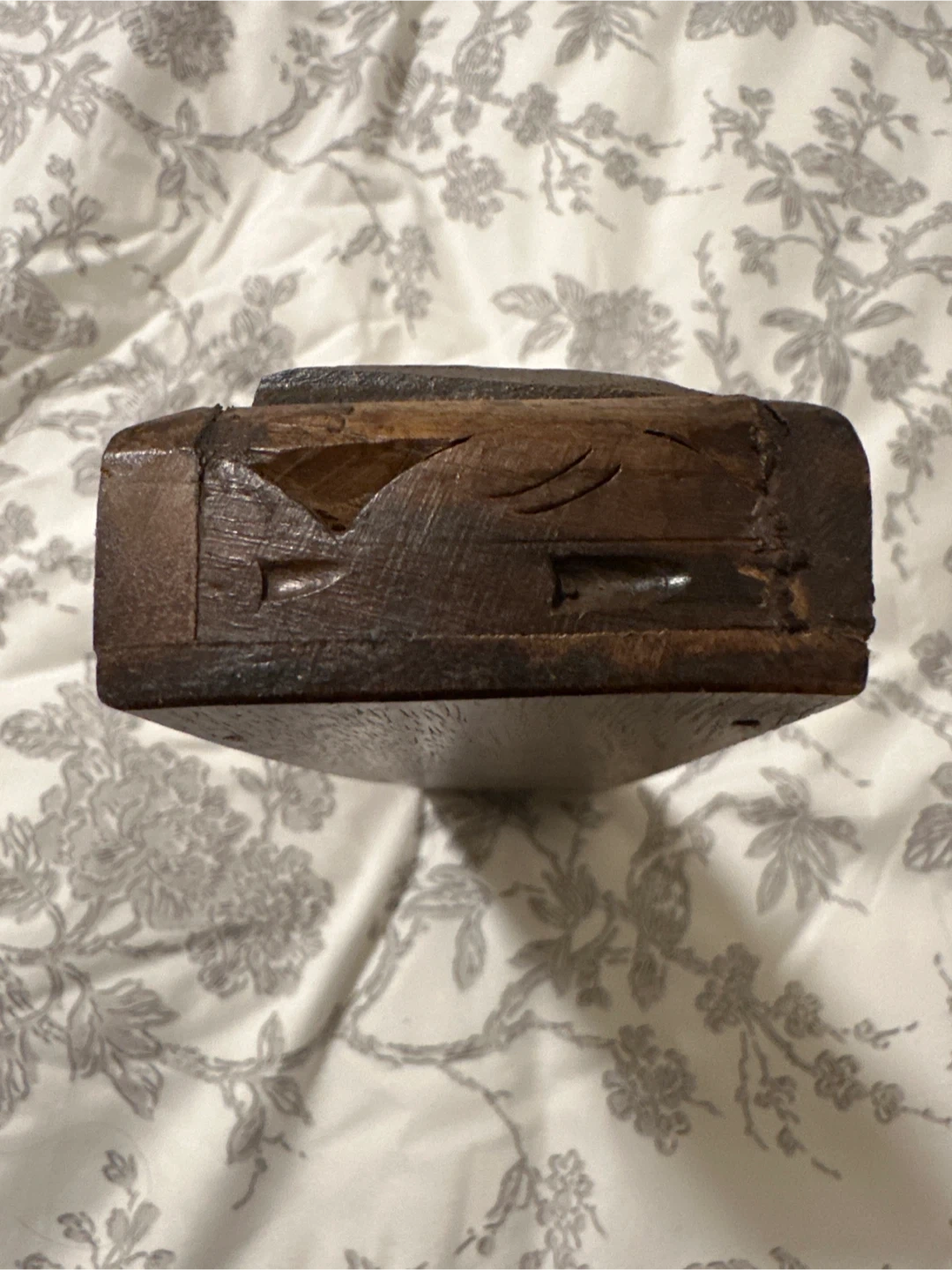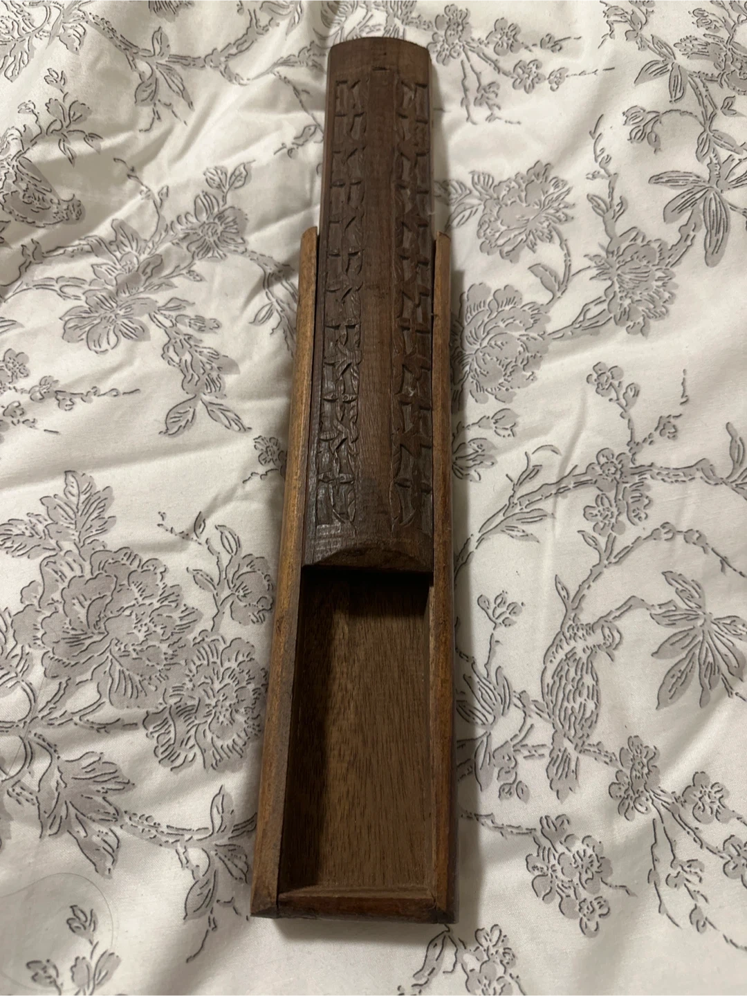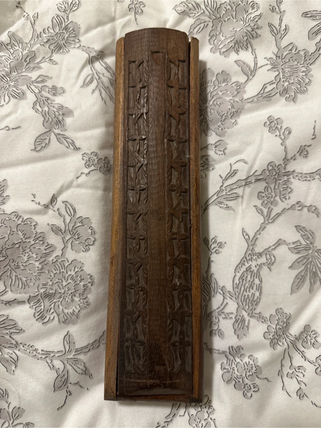A beautifully carved teak wooden box with intricate detailing on the lid and sides. It's perfect for storing small treasures or keepsakes. The box is artisan carved from solid teak wood and features a secure, sliding lid design. It's a lovely decorative piece for any home! Dimensions are 24x6x3 cm.