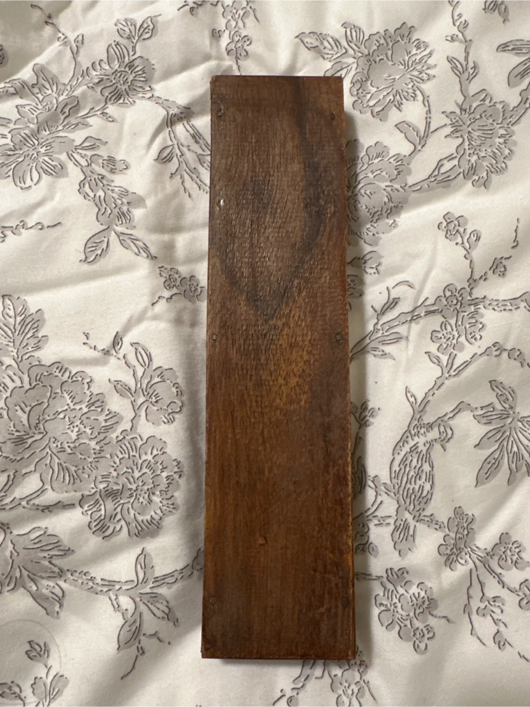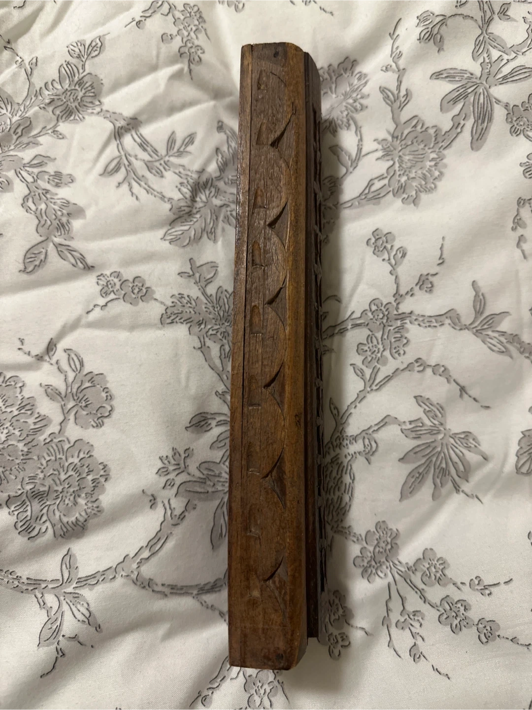 A beautifully carved teak wooden box with intricate detailing on the lid and sides. It's perfect for storing small treasures or keepsakes. The box is artisan carved from solid teak wood and features a secure, sliding lid design. It's a lovely decorative piece for any home! Dimensions are 24x6x3 cm.