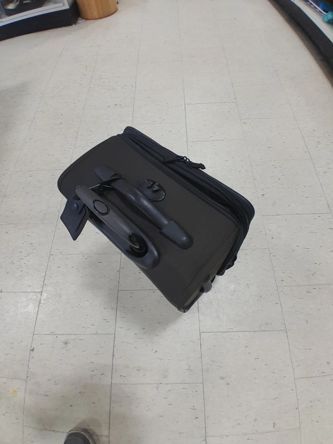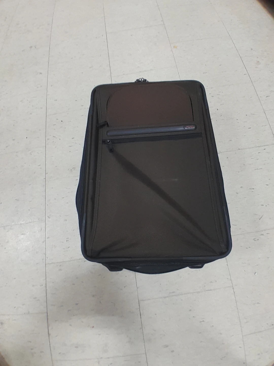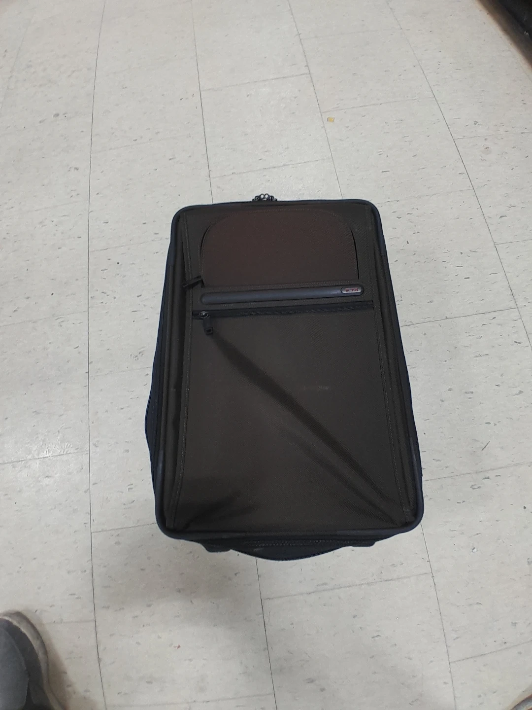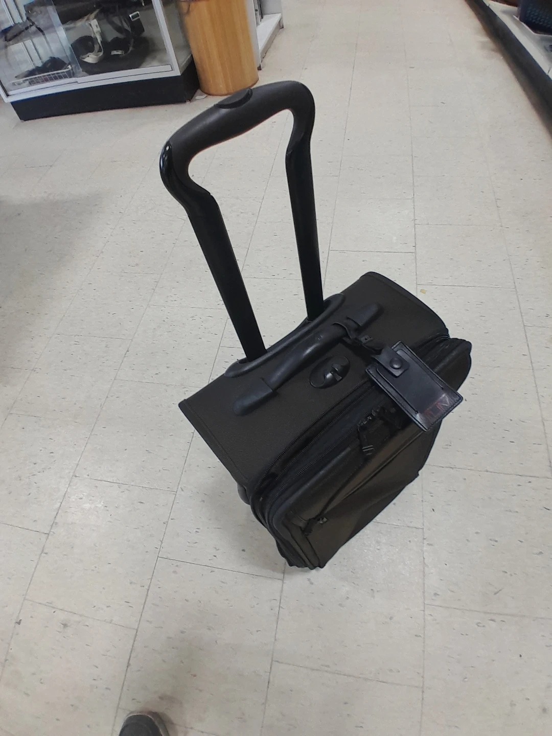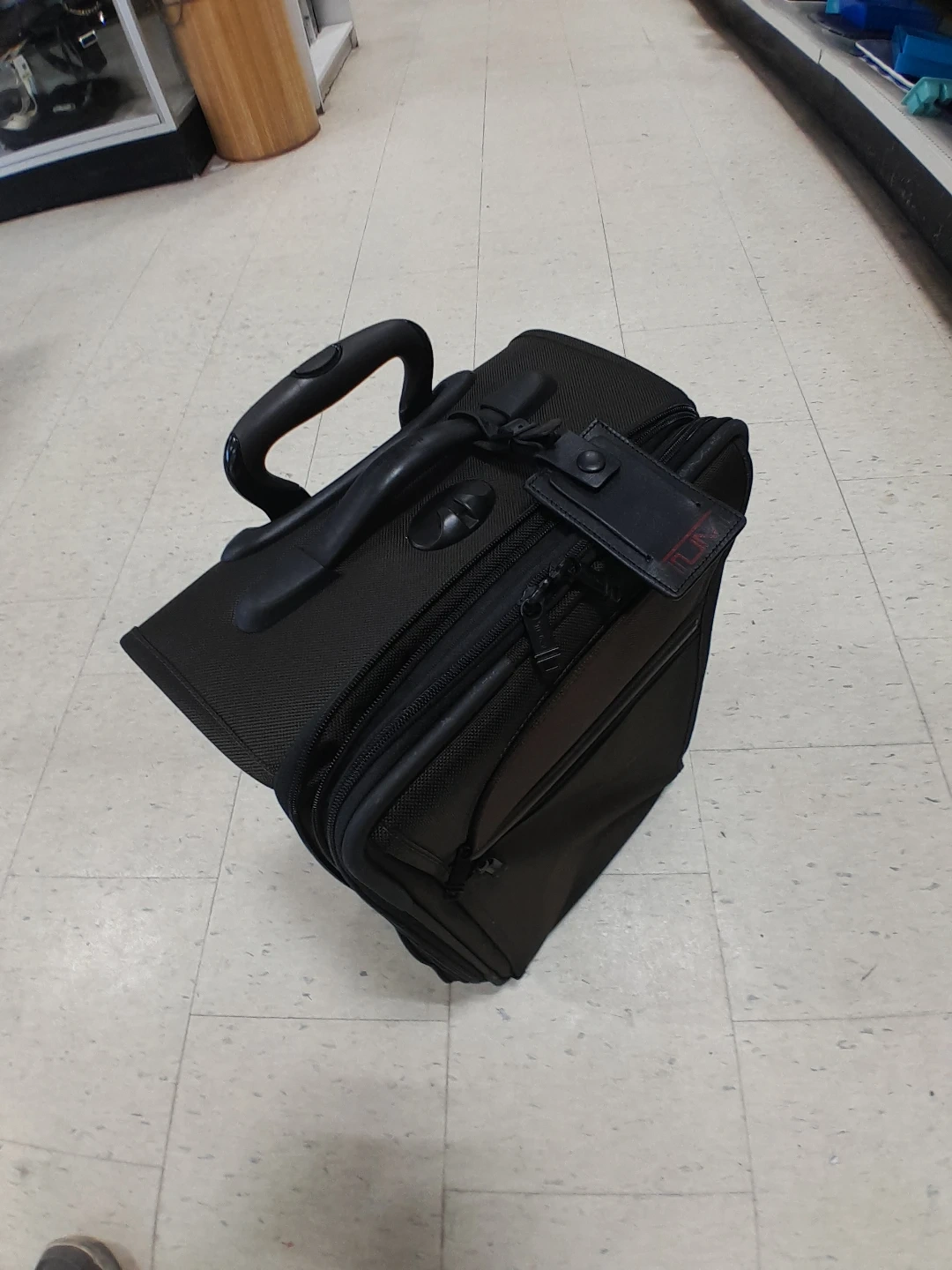 Tumi rolling suitcase. It's black with a telescopic handle and exterior pockets. Made from durable fabric