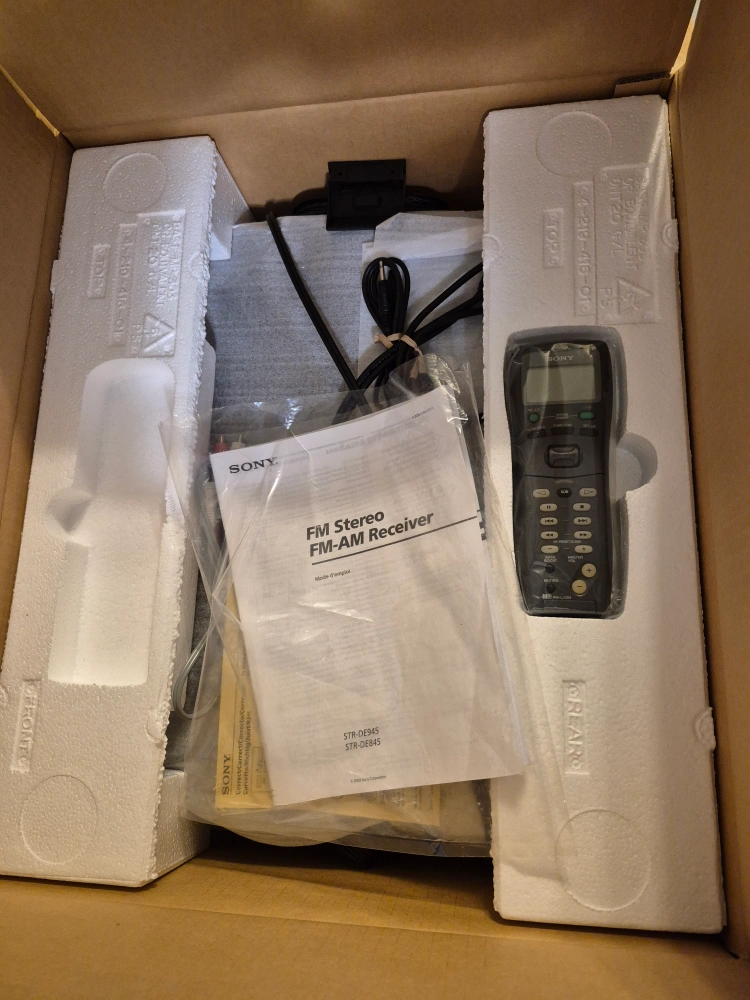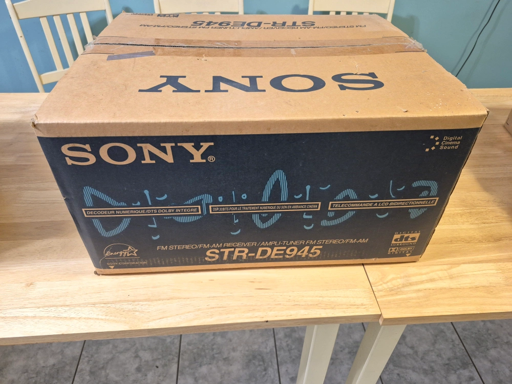 Vintage Sony STR-DE945 stereo receiver. New, unopened box. Includes remote and manual. FM/AM tuner. Digital audio/video receiver. Multi-channel decoding.