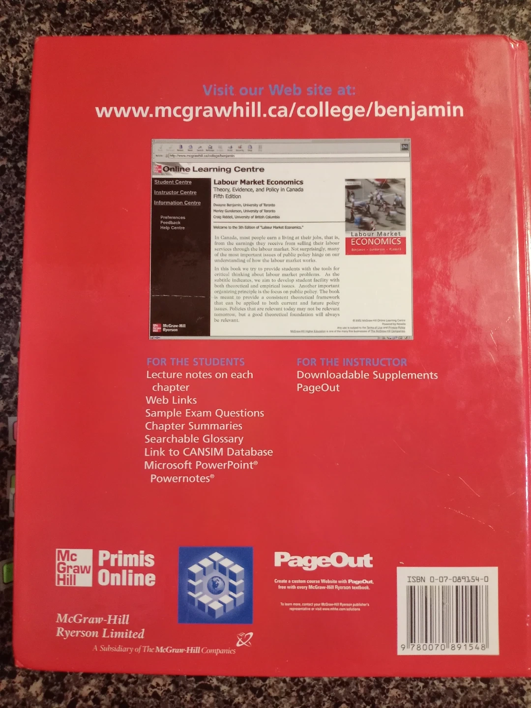 This textbook covers Labour Market Economics. It's the fifth edition of the book by Benjamin, Gunderson, and Riddell. Includes supplementary materials on the McGraw Hill Ryerson website.