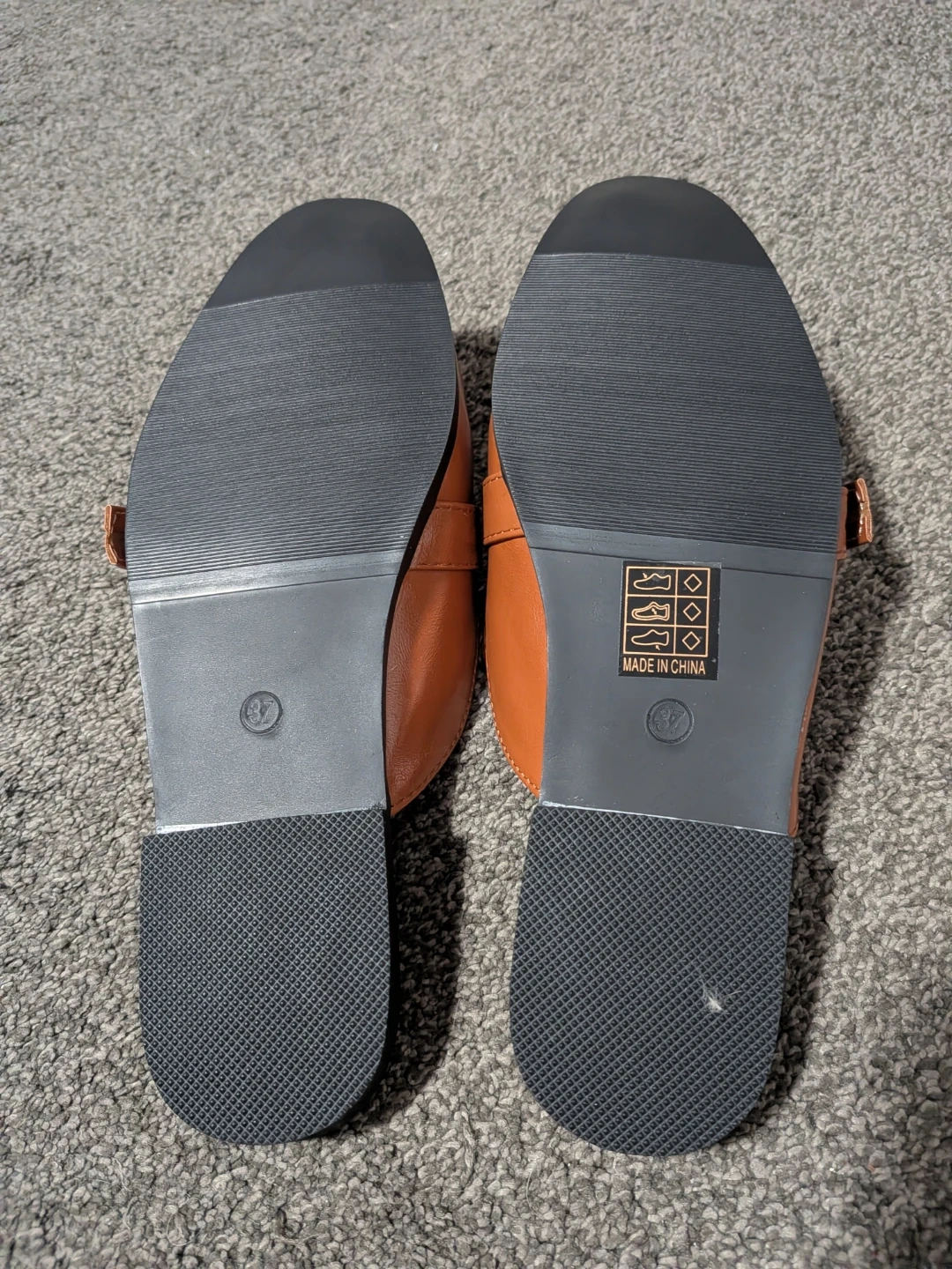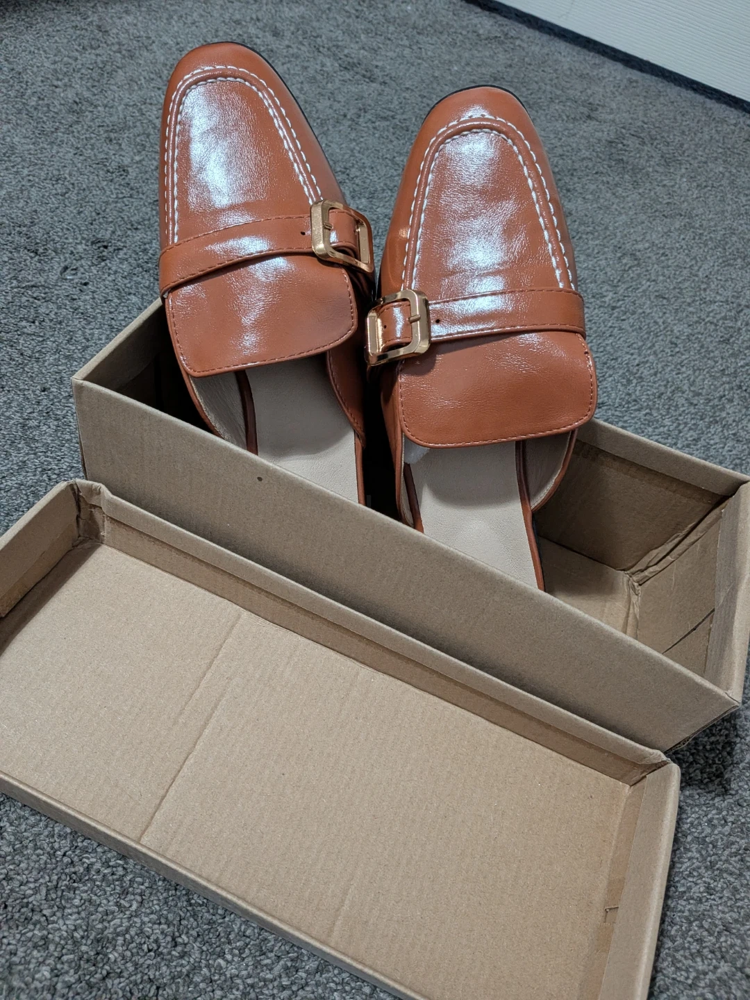 These stylish brown faux leather mules feature a classic loafer design with a decorative buckle. They're a slip-on style with a comfortable fit. Includes original box and dust bag.