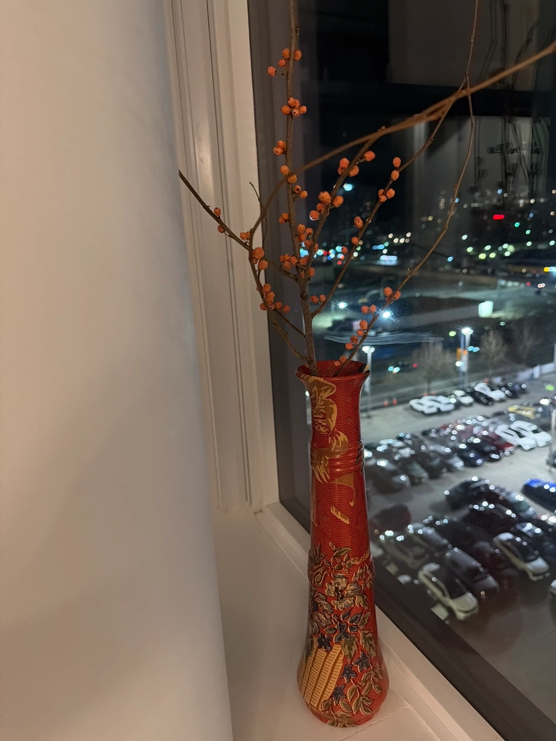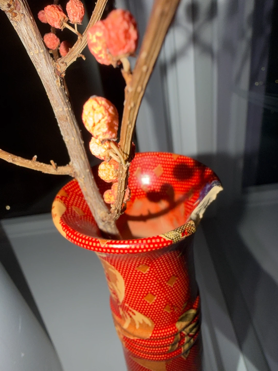 A striking red ceramic vase featuring intricate golden dragon and floral detailing. It comes with dried branches adorned with small orange berries, adding a touch of rustic charm. This unique piece would make a lovely accent for any room, bringing a pop of colour and natural texture.