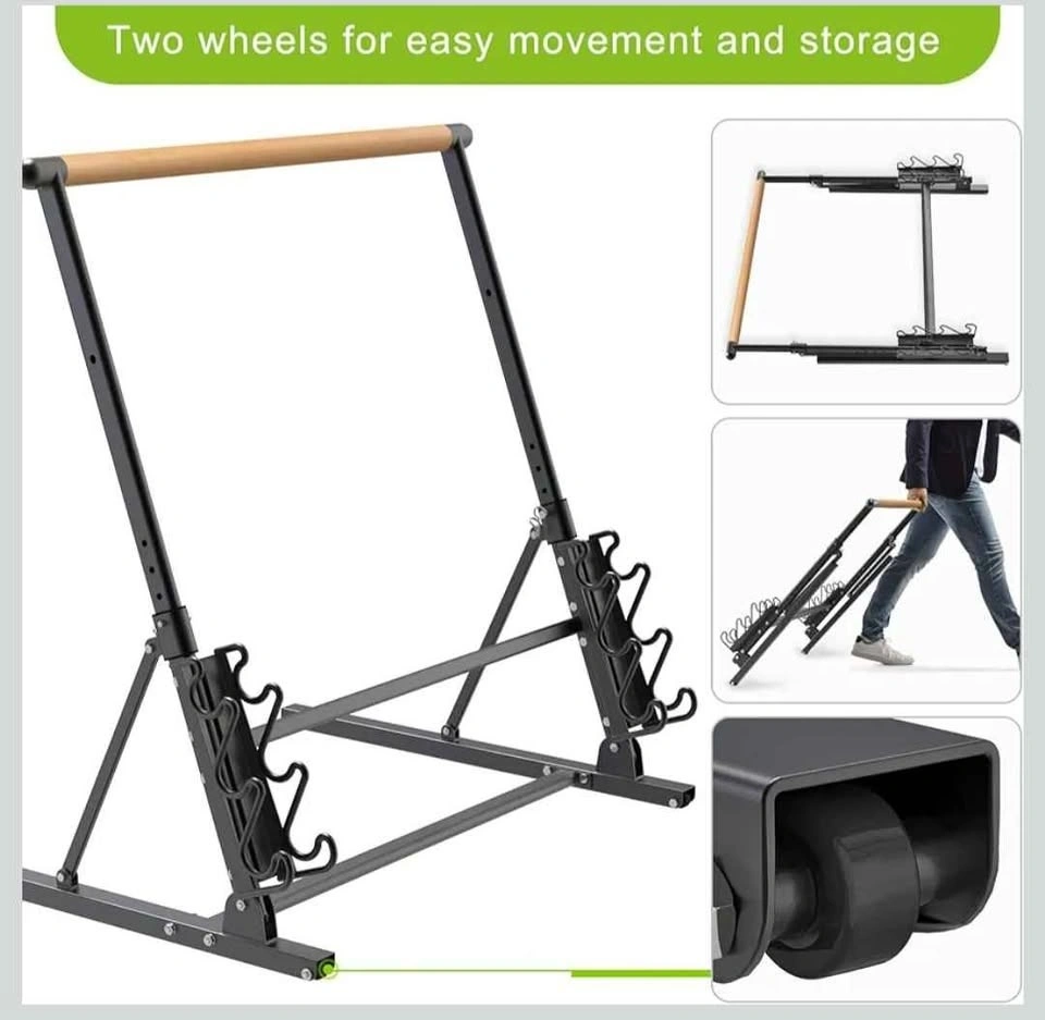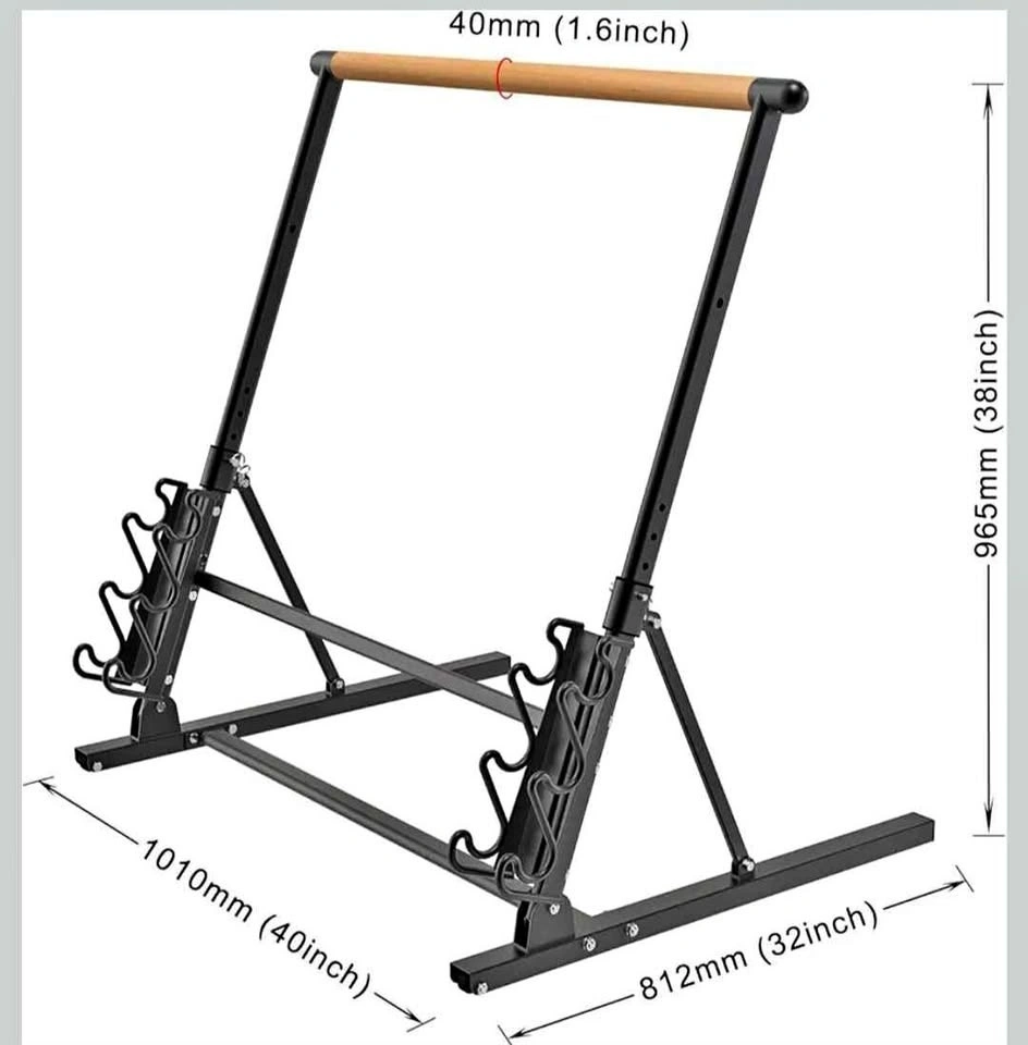 ballet barre. Collapsible for easy storage. Super portable, has wheels. Folds up for easy storage. Dimensions are about 38 inches tall, 40 inches wide. The weight holders shown on the bottom are not included. Brand new
