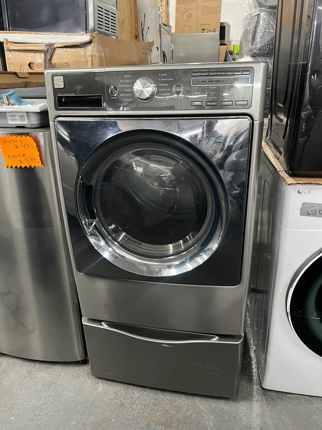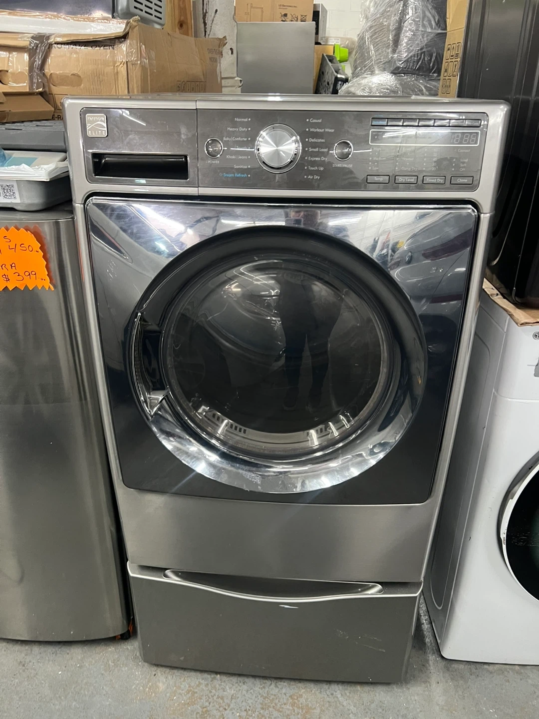 This is a Kenmore front load washing machine. It has a stainless steel drum and multiple cycle options. Includes a drawer for detergent or fabric softener.