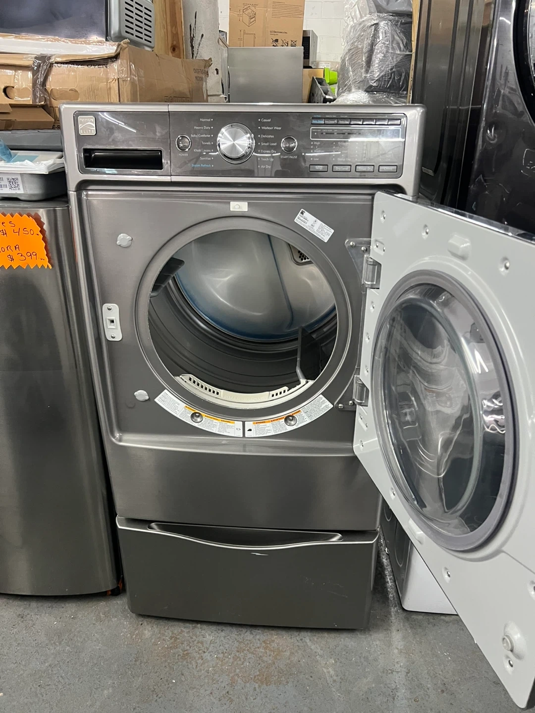 This is a Kenmore front load washing machine. It has a stainless steel drum and multiple cycle options. Includes a drawer for detergent or fabric softener.