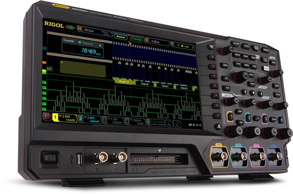 This is a RIGOL MSO5104 oscilloscope. It features a digital display and multiple input channels. It's a powerful tool for electronic measurements.