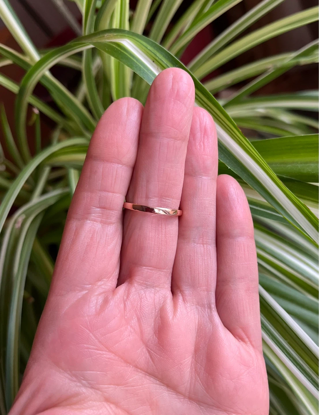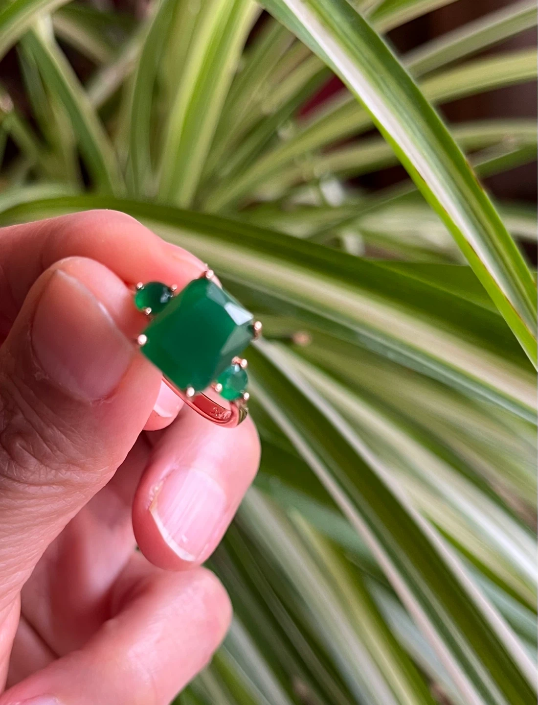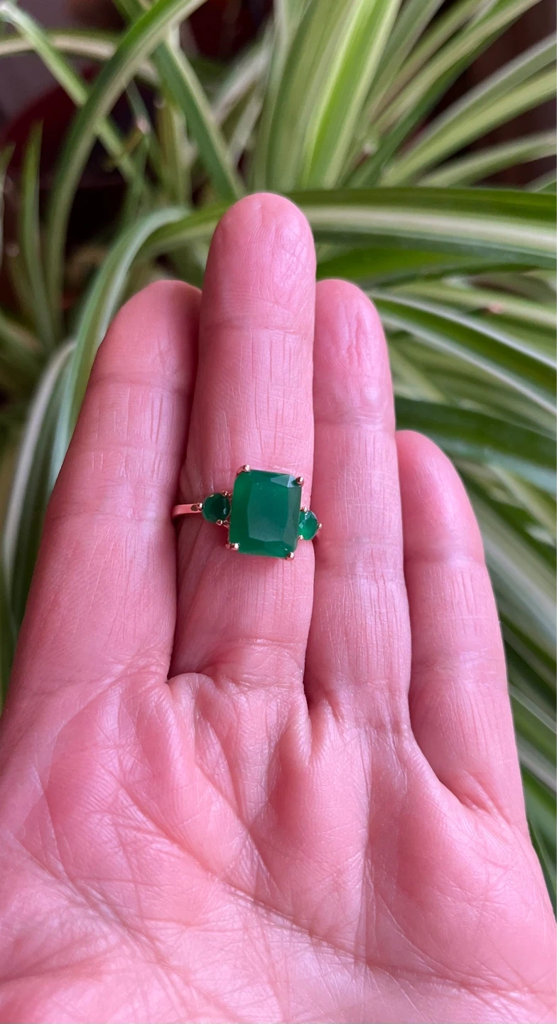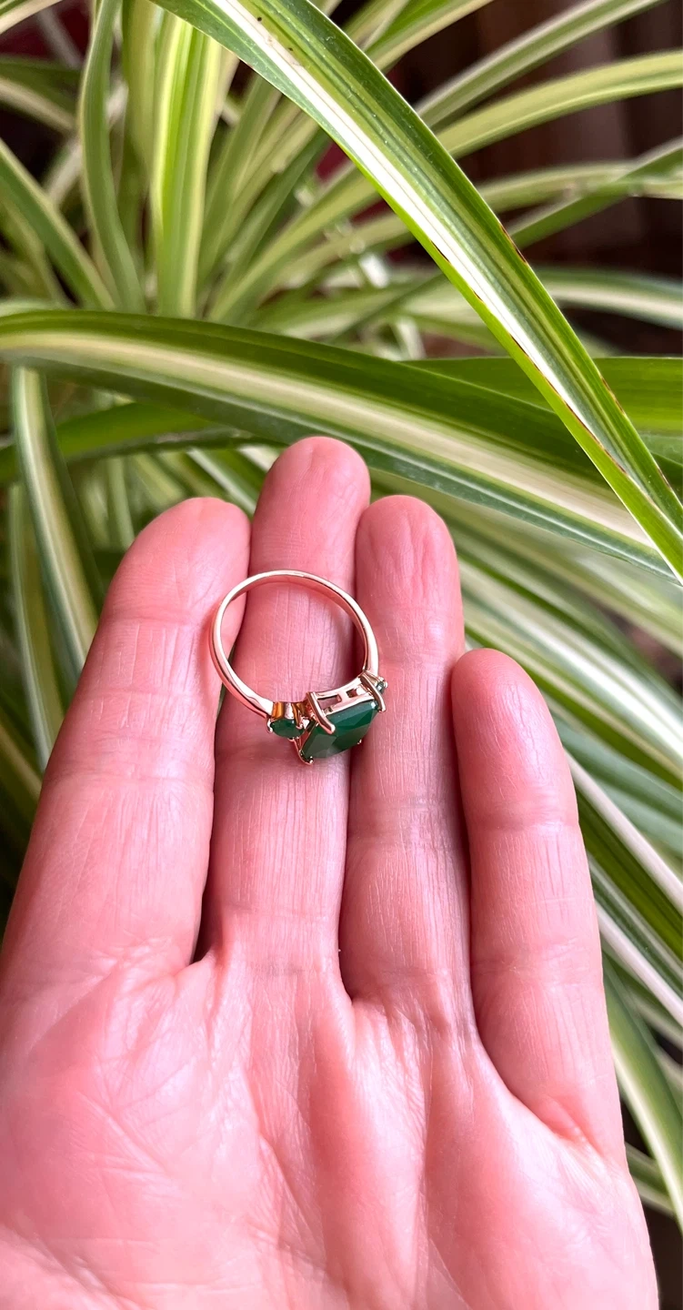 A beautiful ring featuring a central emerald-cut zircon, flanked by two smaller stones. It's set in a rose gold plated band.