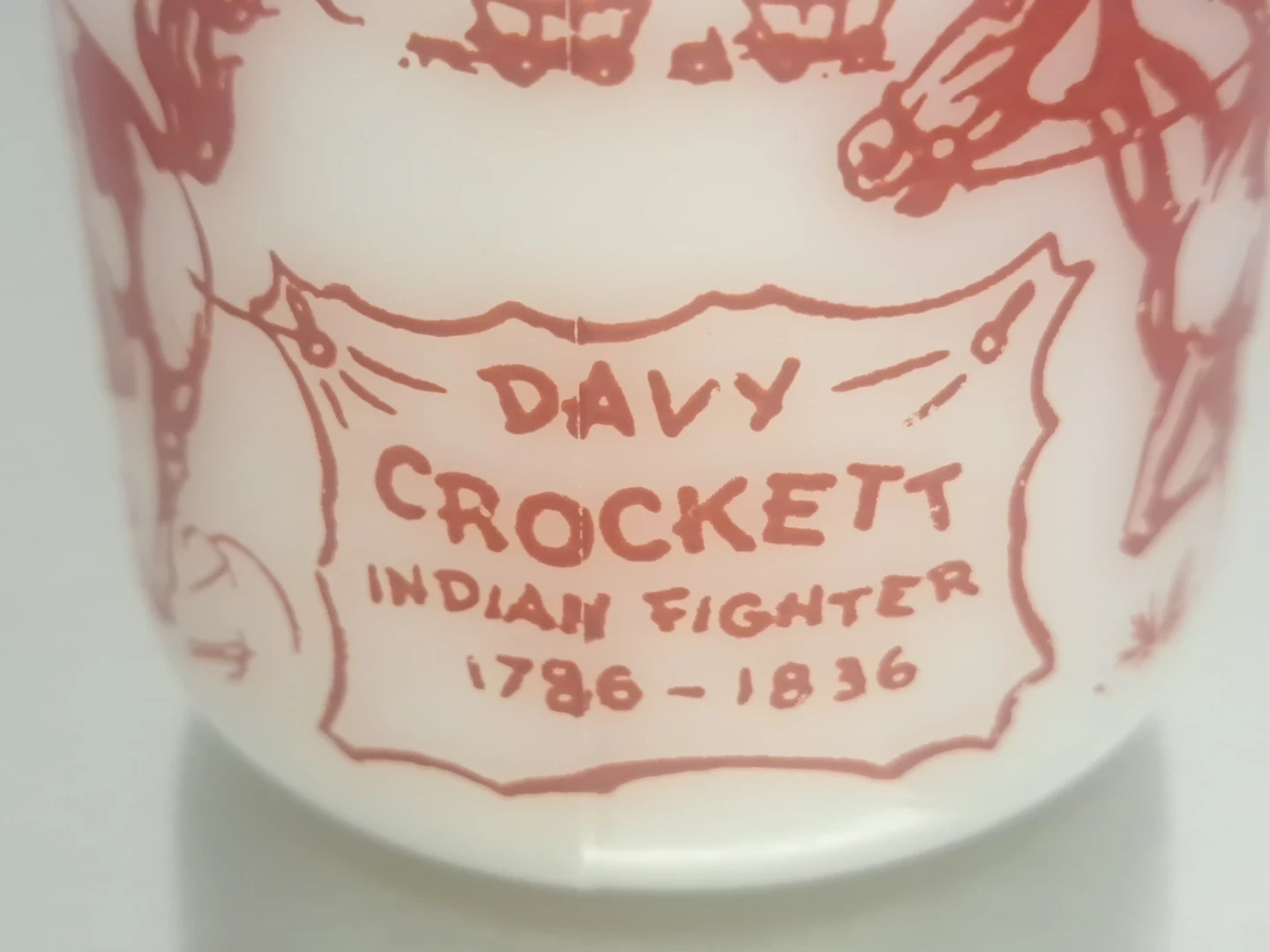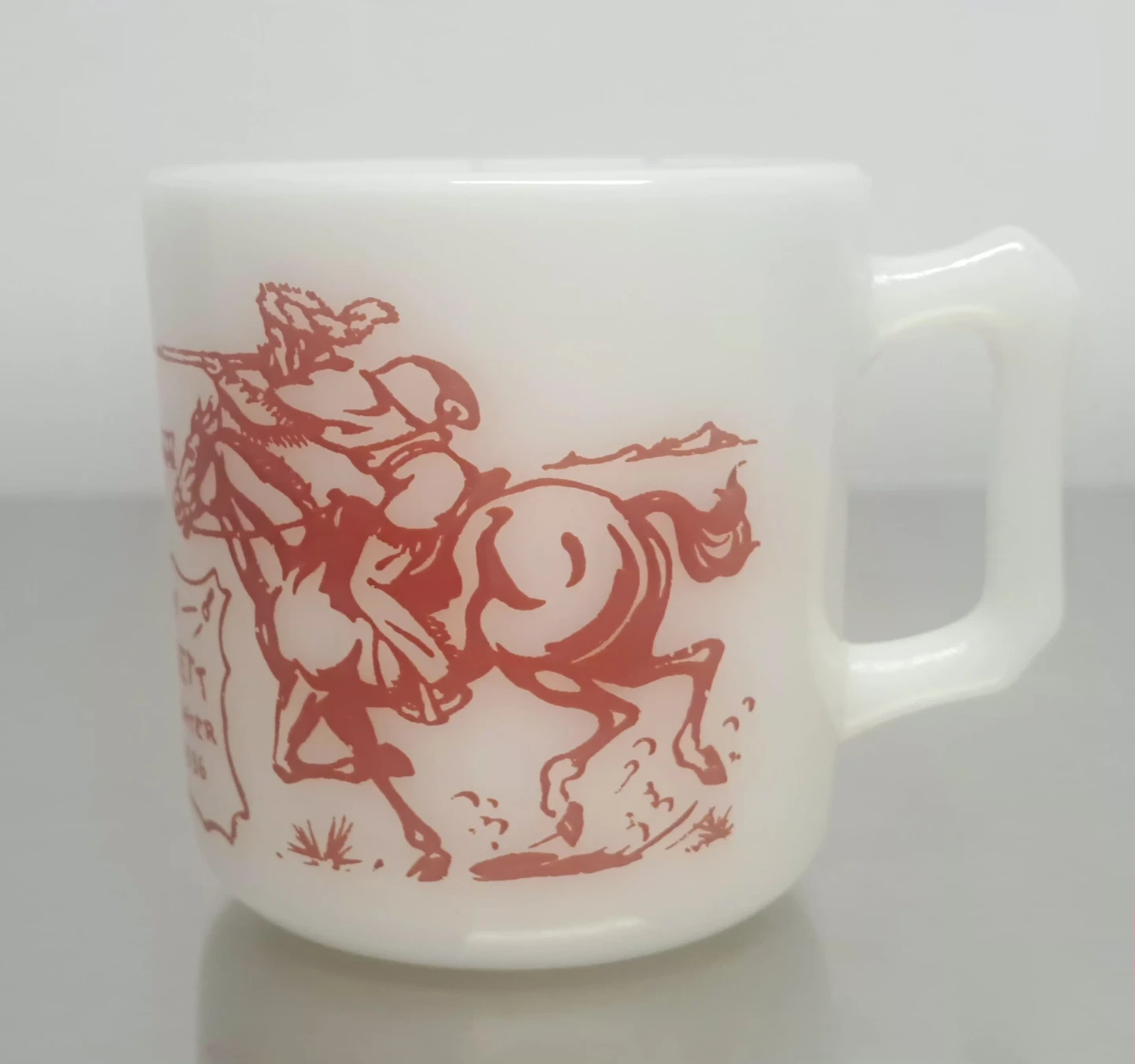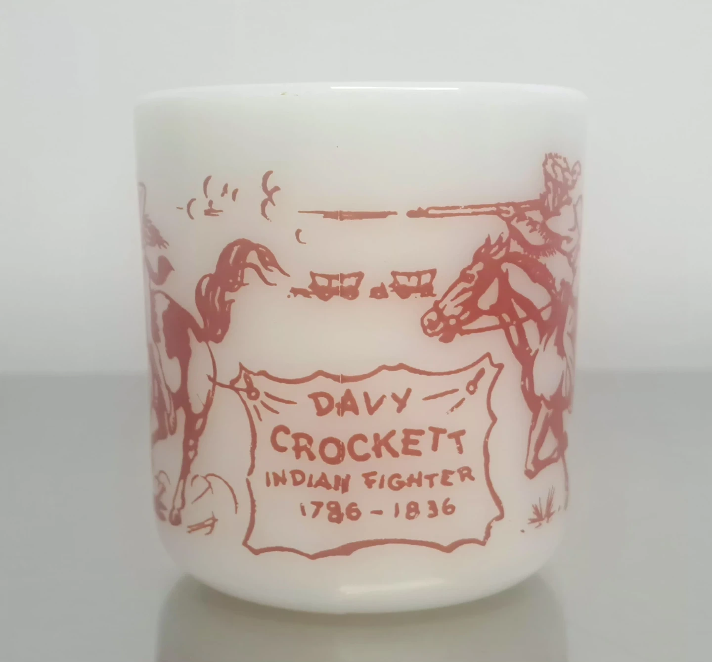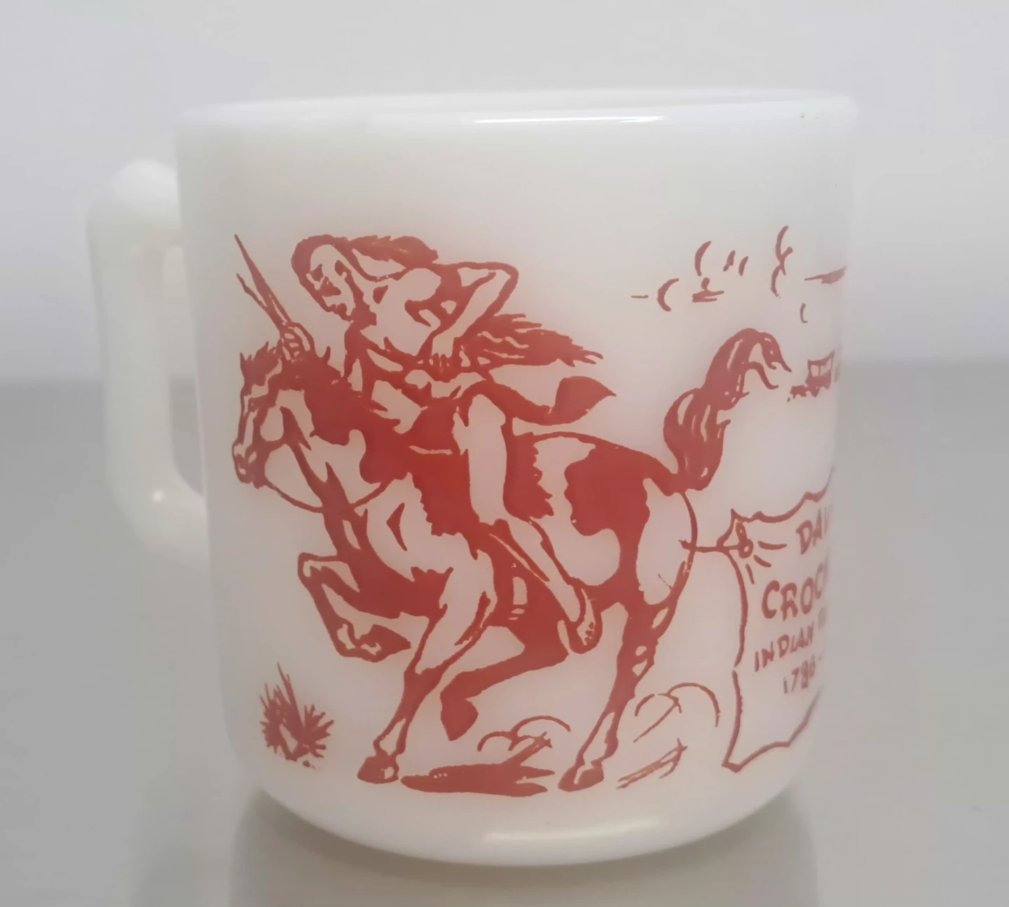 This 1950's Hazel Atlas mug features a red graphic design of Davy Crockett with biographical dates "1786-1836". It's a unique piece for collectors or fans of historical figures. Milk glass material. This mug is great for enjoying your favourite beverage!