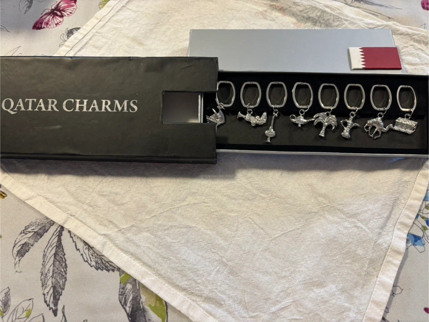 Selling a set of Qatar Charms, complete with the original box! The charms feature iconic symbols. Arabian charms with clip that are removable for use on bangle and necklace, or wine glasses.