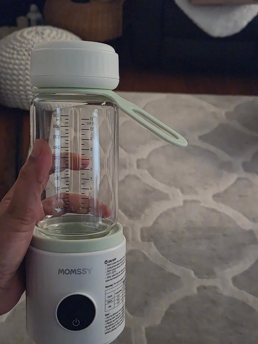This MOMSSY bottle warmer is great for on-the-go use. It has measurement markings on the glass bottle. The base has controls for temperature selection.