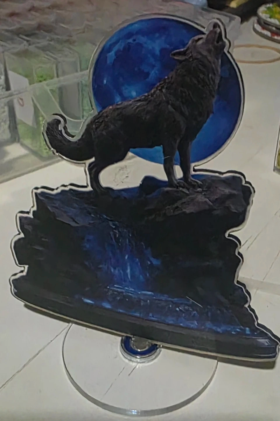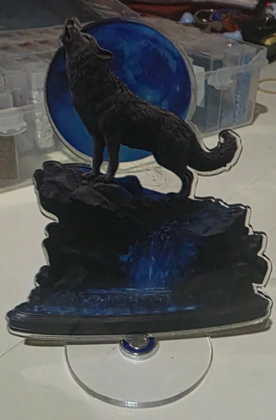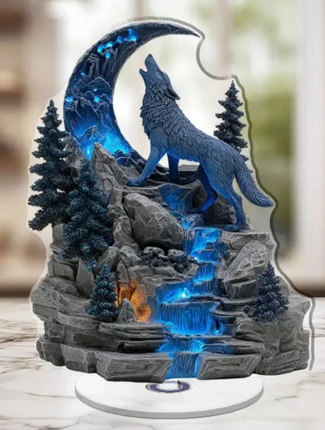 Acrylic display featuring a wolf howling at a crescent moon. It's a cool piece with a rocky landscape and waterfall. The design has blue LED lights that illuminate the scene.