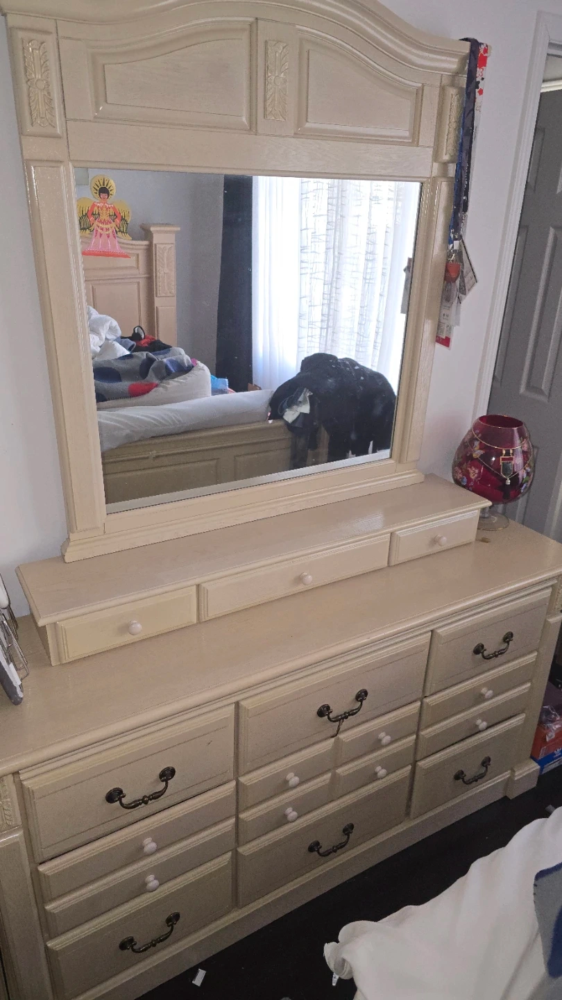 This dresser features a large mirror and ample drawer space. It's a sturdy piece for any bedroom. Nine drawers total for storage. Cream finish.